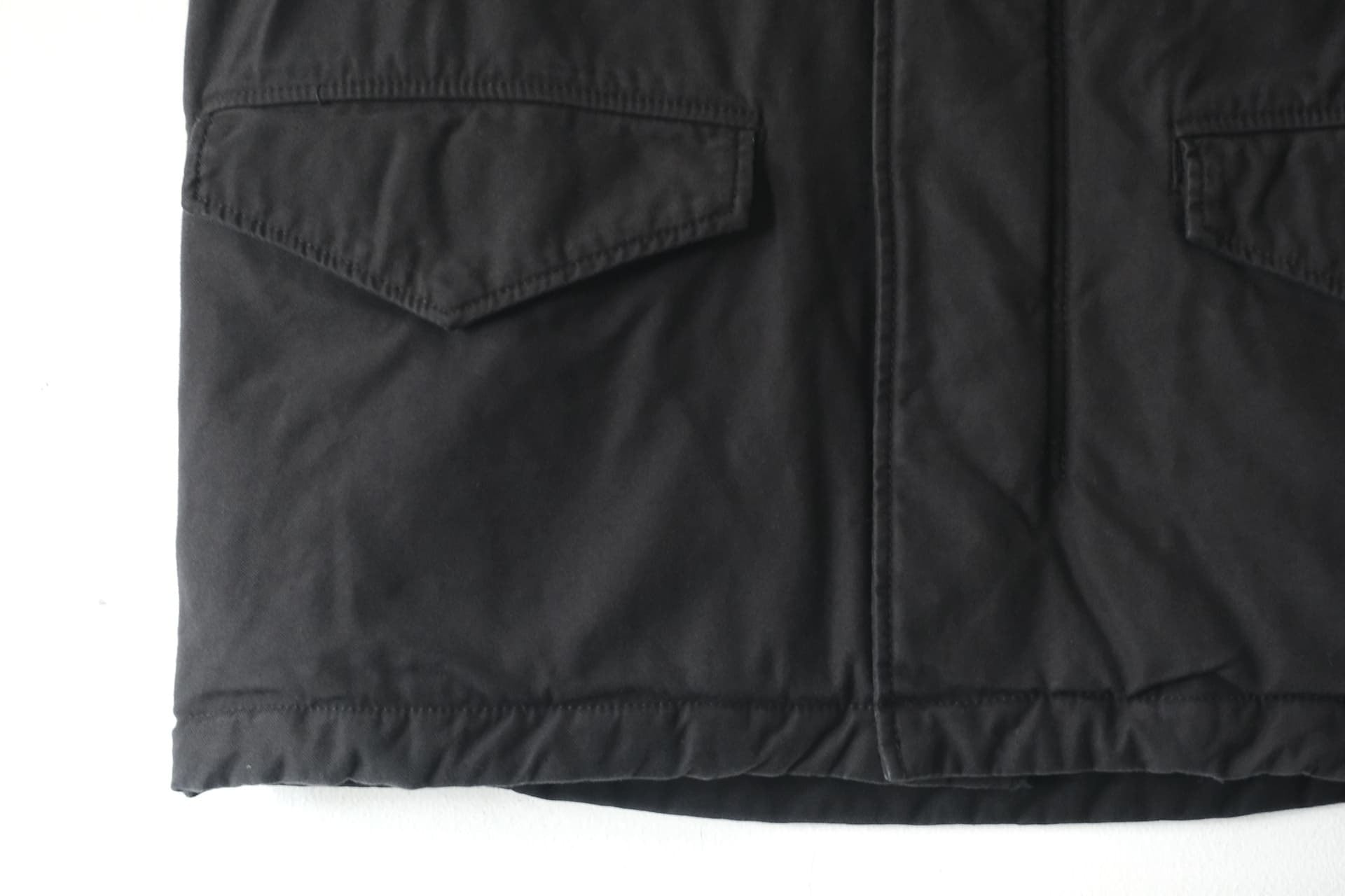 Taking cues from the iconic M-65 jacket, it’s cut from sturdy back satin and treated for a timeworn, vintage character. The vest holds a subtle volume with light padding, allowing it to step easily into the role of outerwear. Oversized flap pockets, complete with depth and structure, give it both presence and practicality.