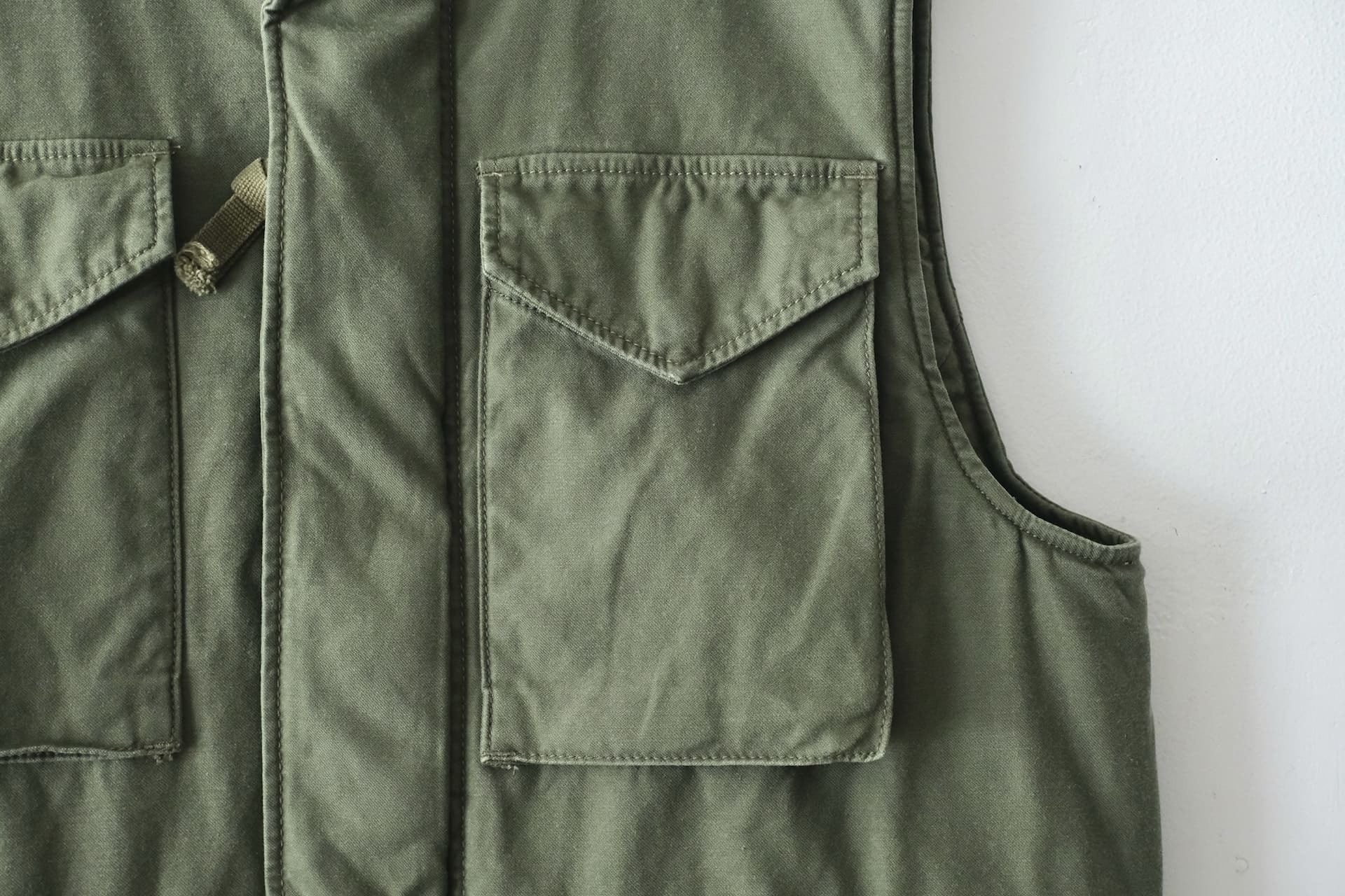 このベストはM-65ジャケットをモチーフに作られていて、表地に強度があるバックサテン地を使用し古着のような風合いの加工を施しています。