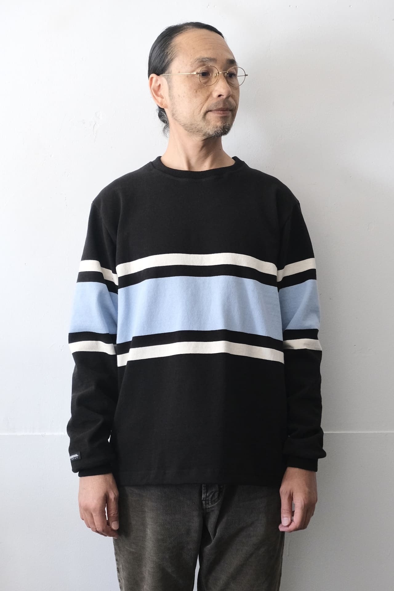 This Directors-exclusive colorway of the classic L/S Crew Neck Shirt uses a heavyweight 12oz cotton jersey, offering a solid, substantial feel. The standard border stripe pattern—a BARBARIAN staple—is reimagined here in a refined palette: a black base, powder blue wide stripe, and ivory fine stripes for a clean, elevated look.