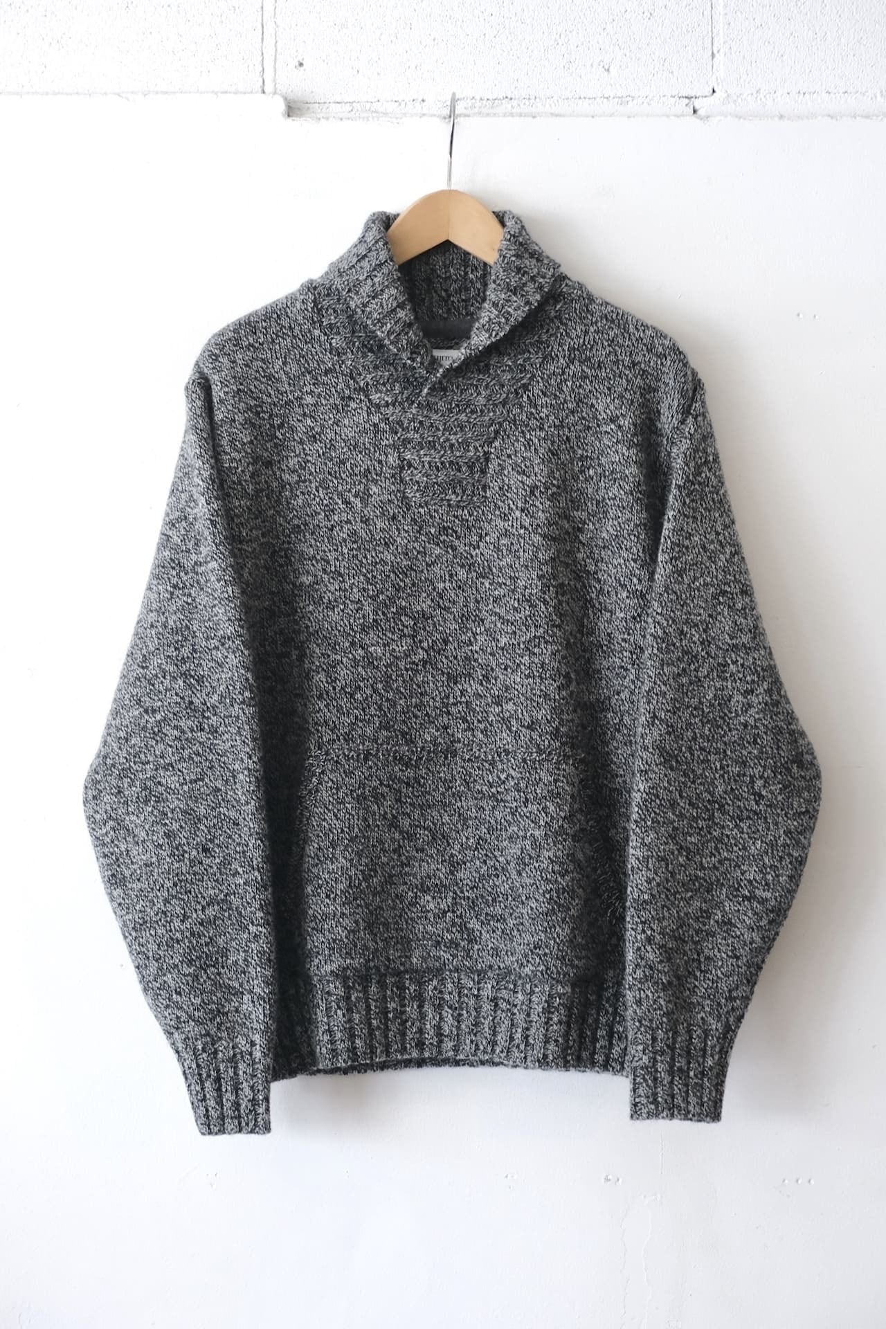 シルエットはゆったり目になり、ショールカラーとカンガルーポケットが特徴的です。