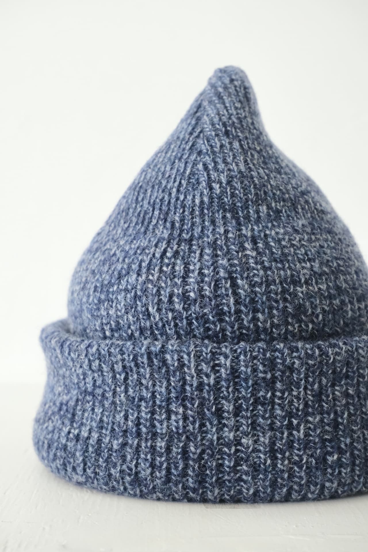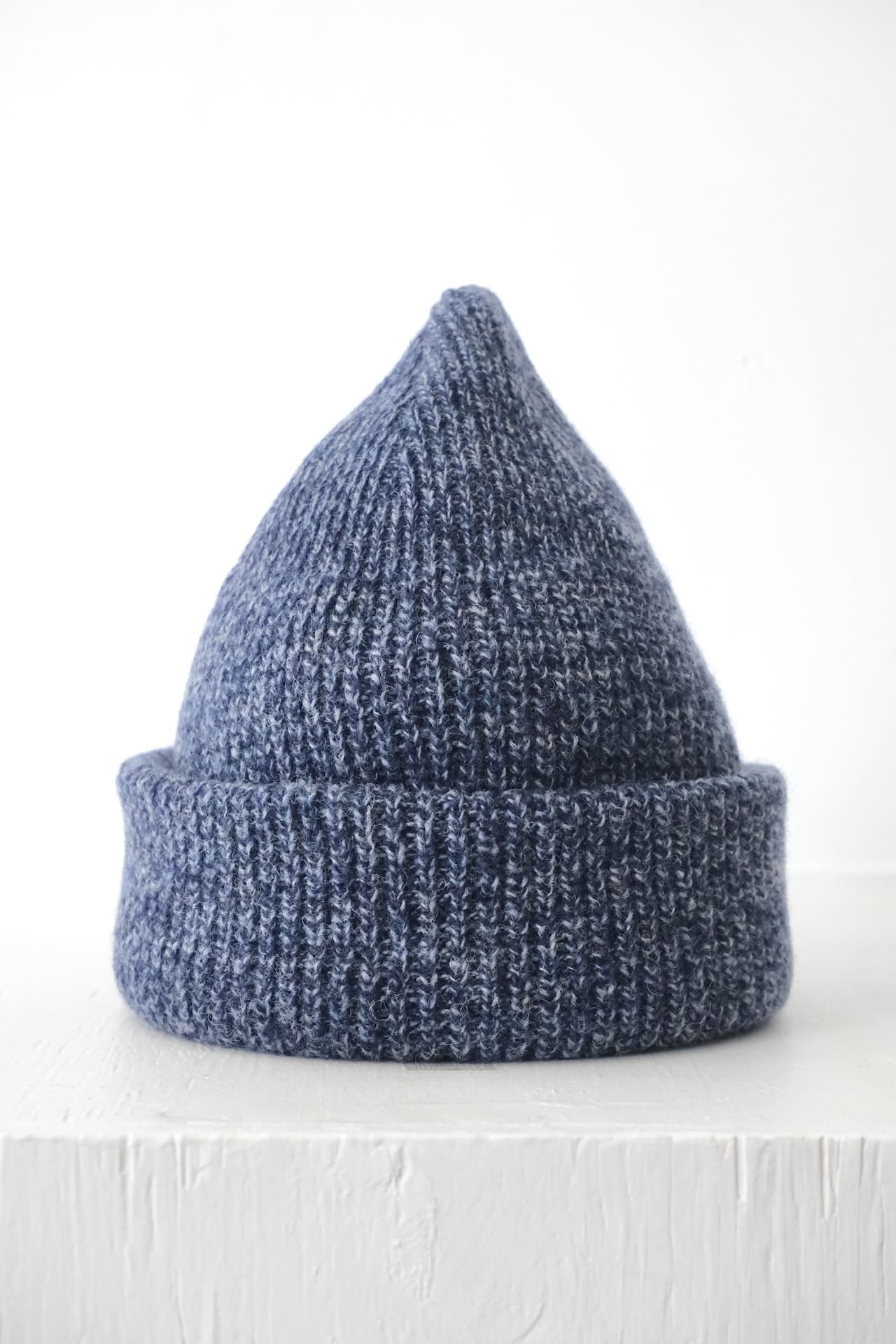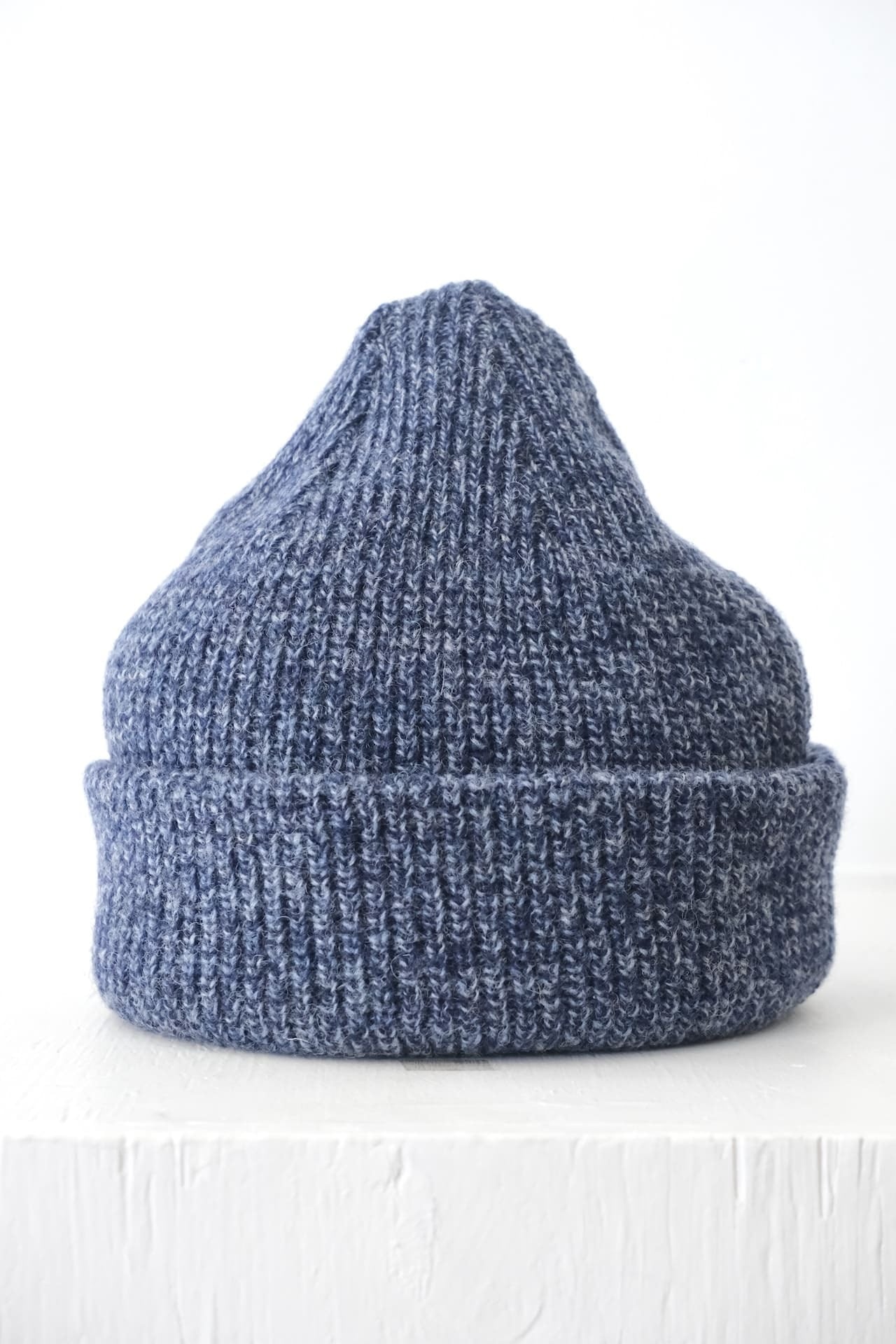 このニットキャップはシェットランドウールとメリノウールを混紡した糸で編み立て、見た目より非常に軽く保温と保湿性に優れています。