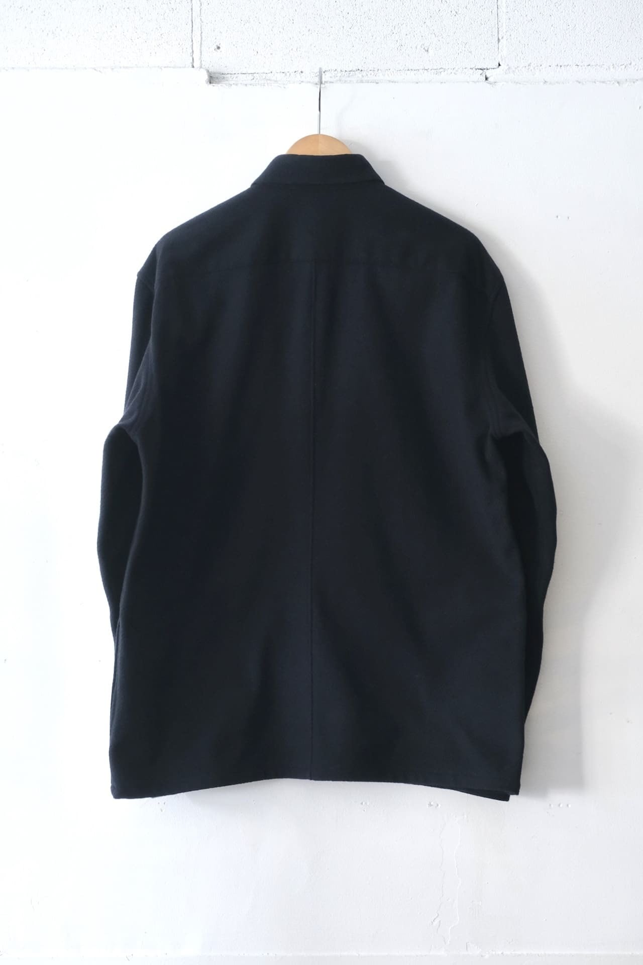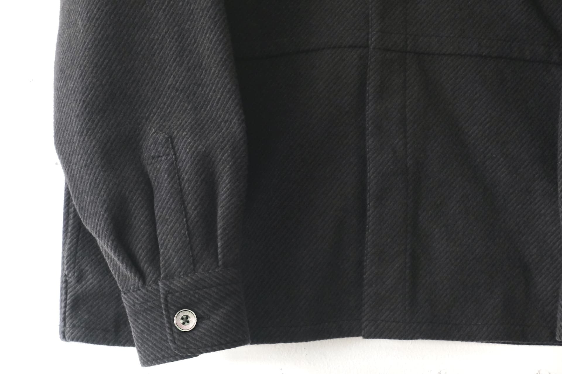 Crafted from an original twill fabric that blends recycled wool, it offers a smooth handfeel and impressive warmth. The boxy, slightly relaxed silhouette and the subtly weighty fabric give it that outerwear-leaning presence. Side-seam pockets on both sides add a clean, functional touch.