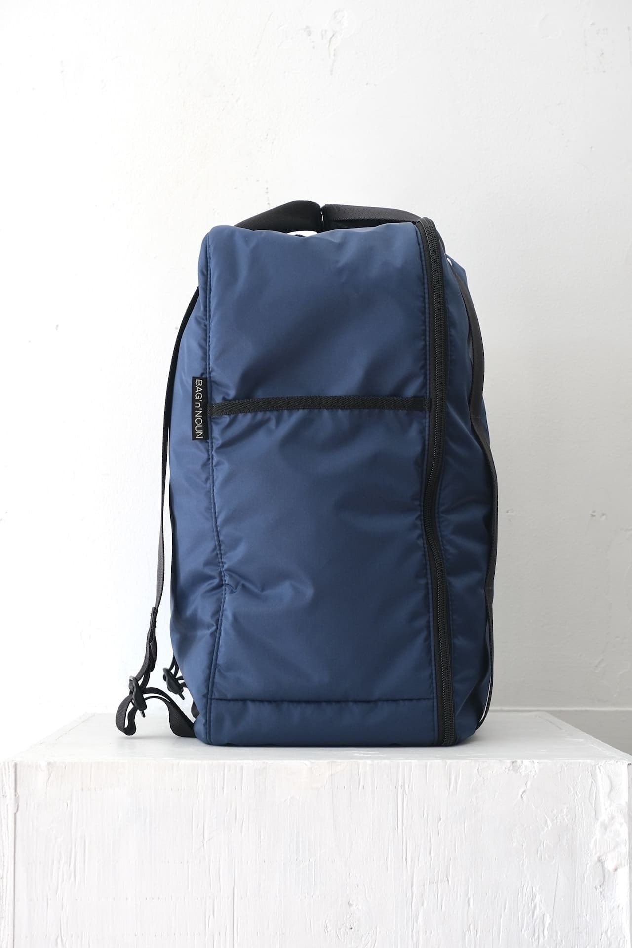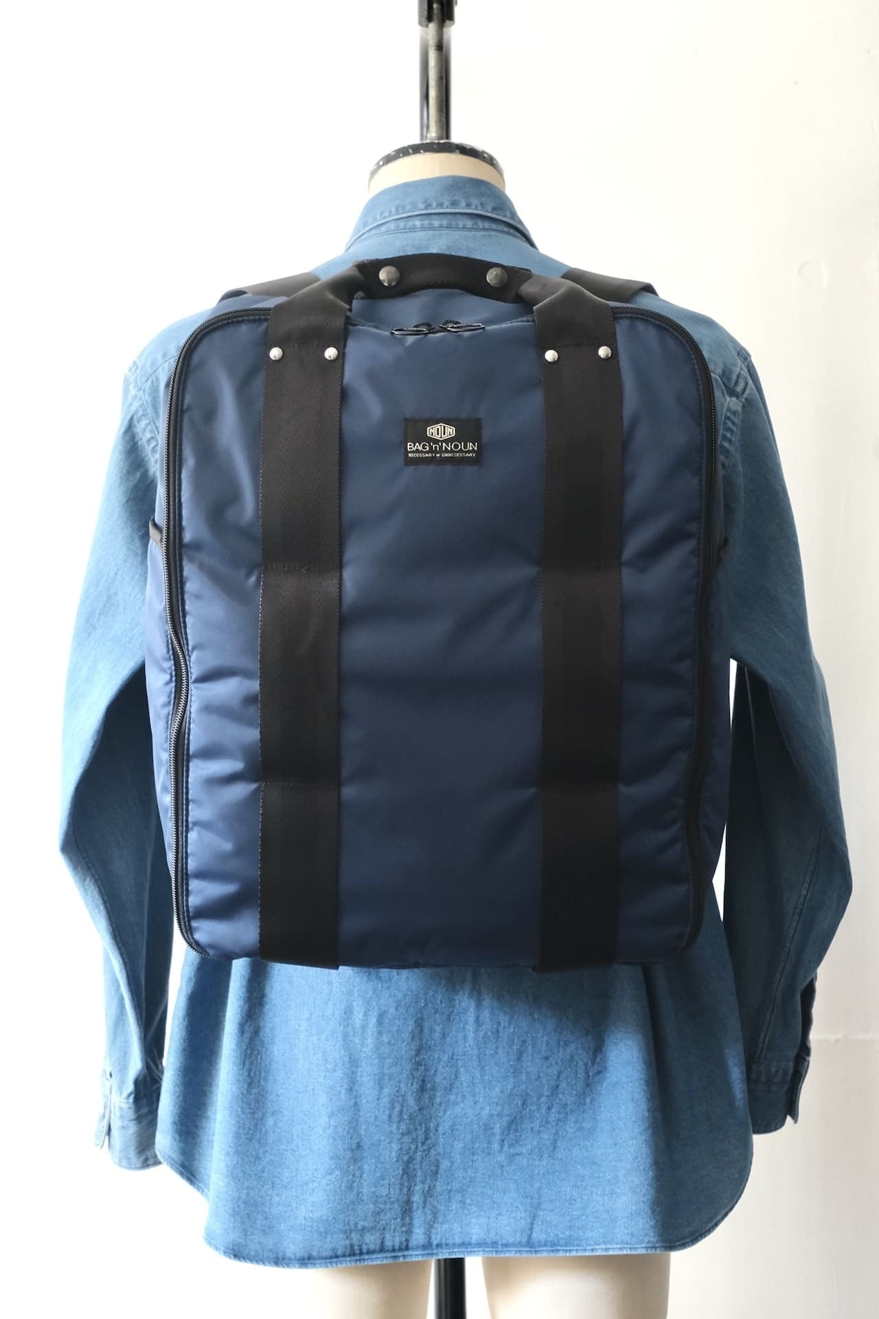 このリュックはナイロン100%の生地を使い、四角い箱型のシルエットで背負ったり手で持ったりと2通りの使い方ができます。