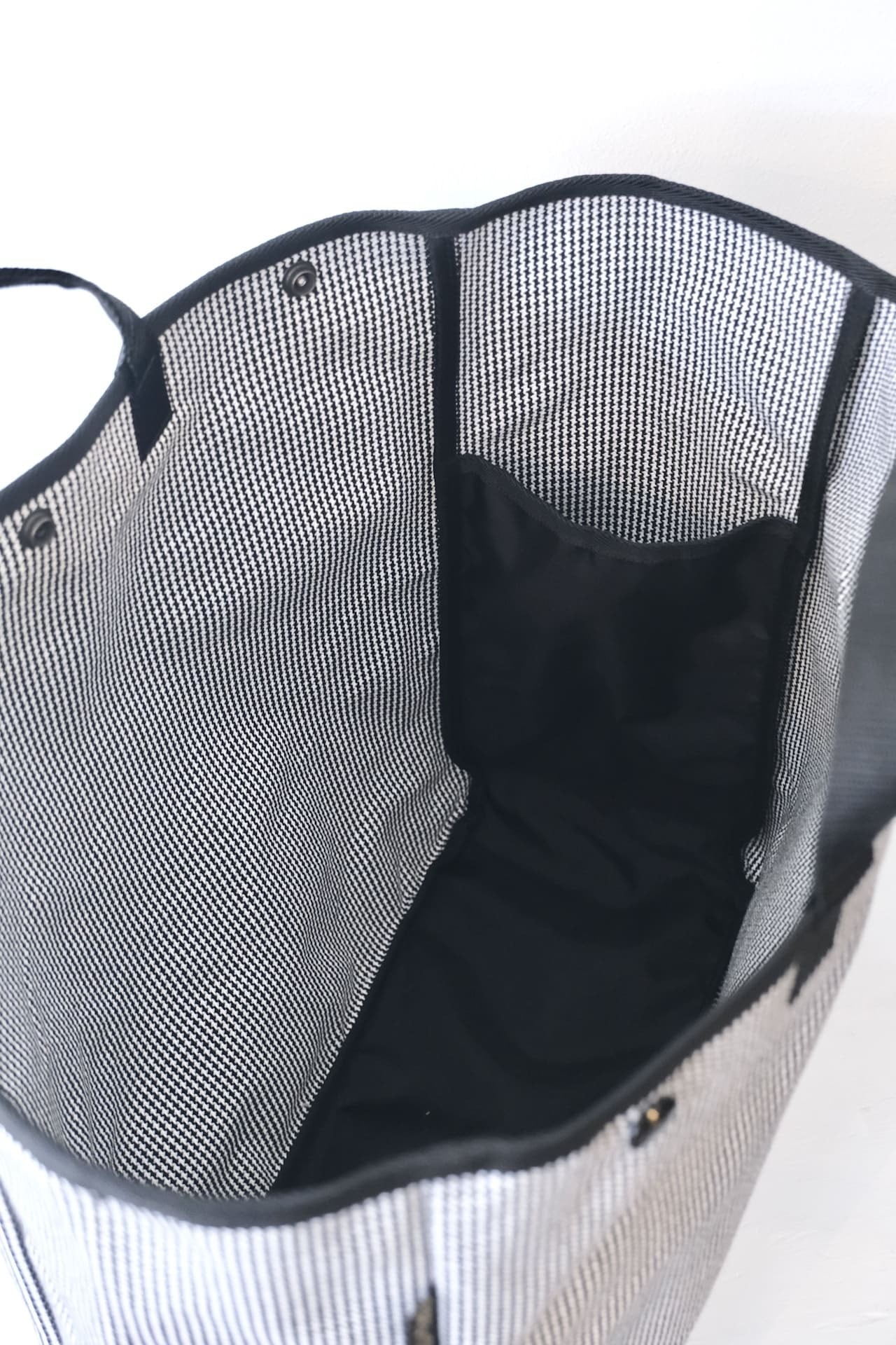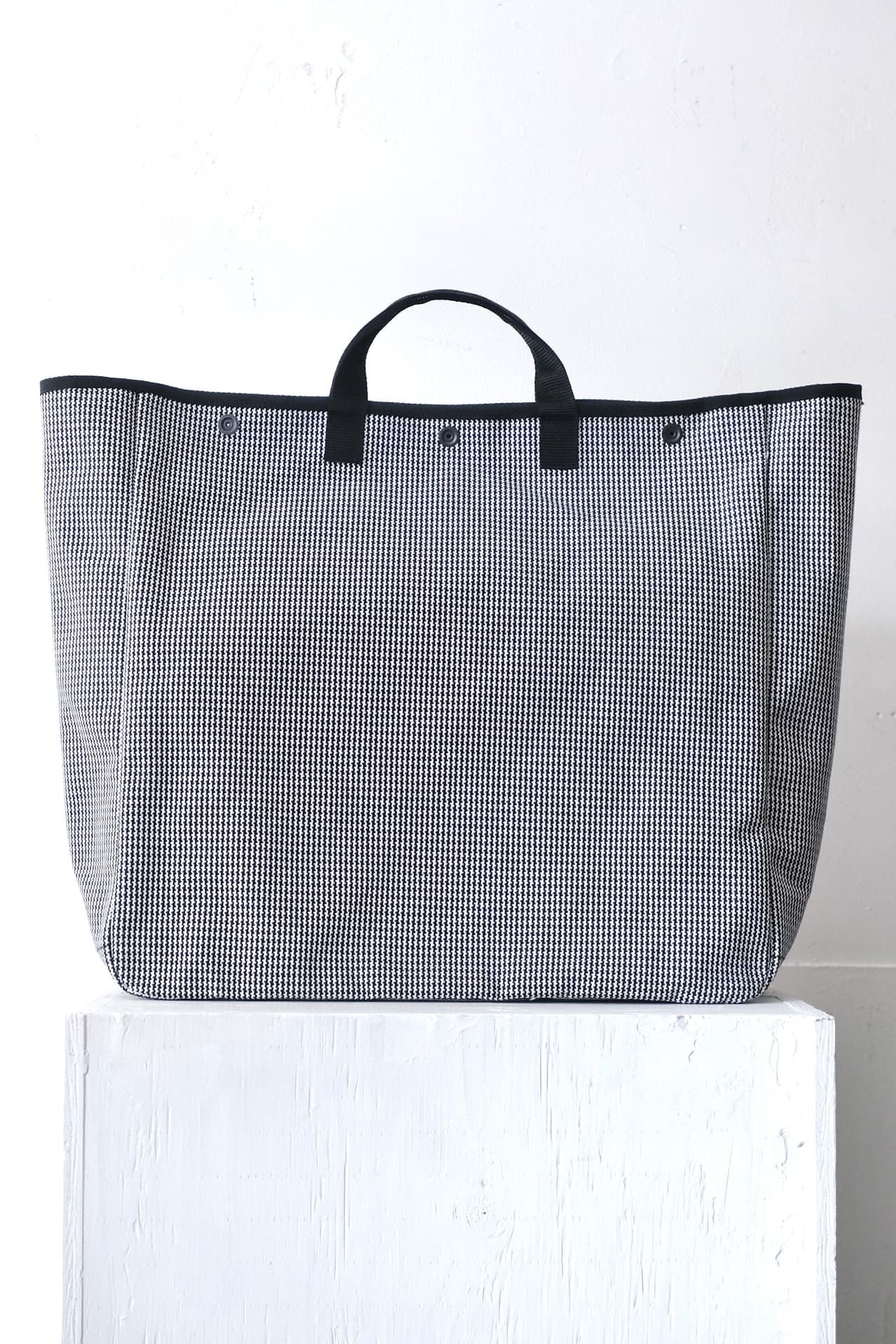 It’s made from a firm, yarn-dyed No.6 canvas in a crisp houndstooth pattern. The black handles and piping keep the silhouette sharp and minimal. A snap closure offers quick access, while slim vertical pockets inside add quiet functionality. The shortened handles sit securely in hand, giving the bag a balanced, considered feel.