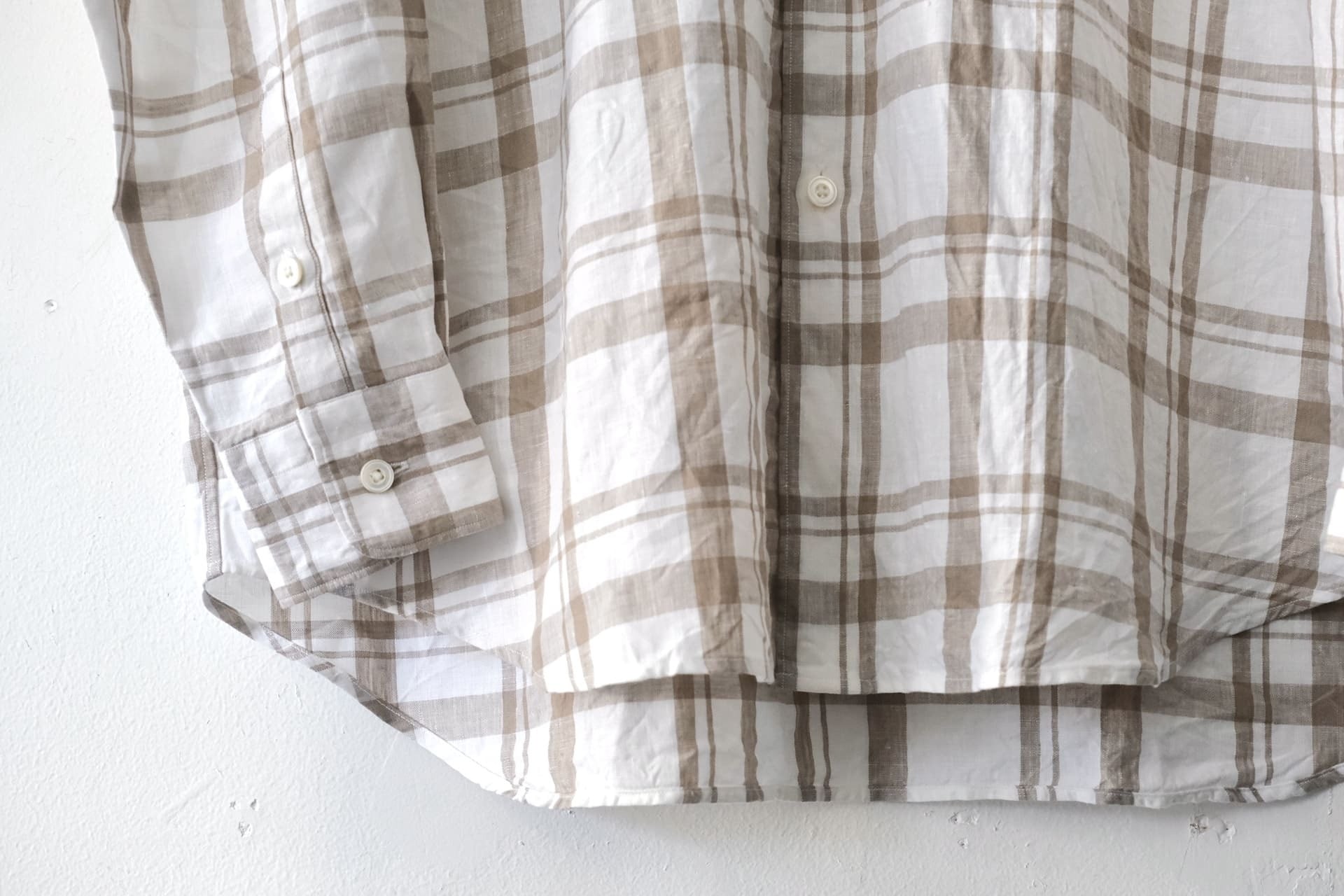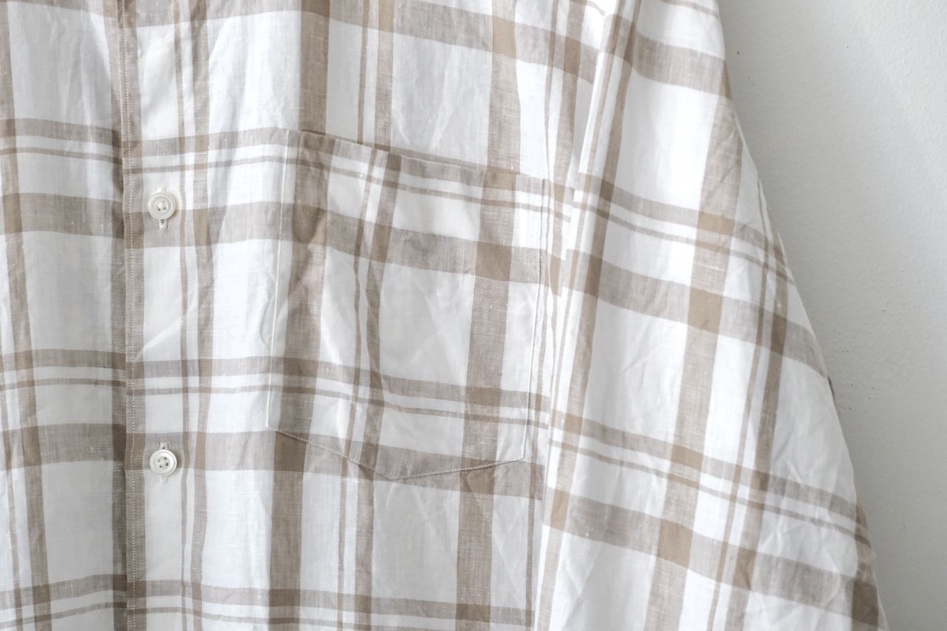 このシャツは、軽くて清涼感のあるリネン100%のチェック生地が使われています。