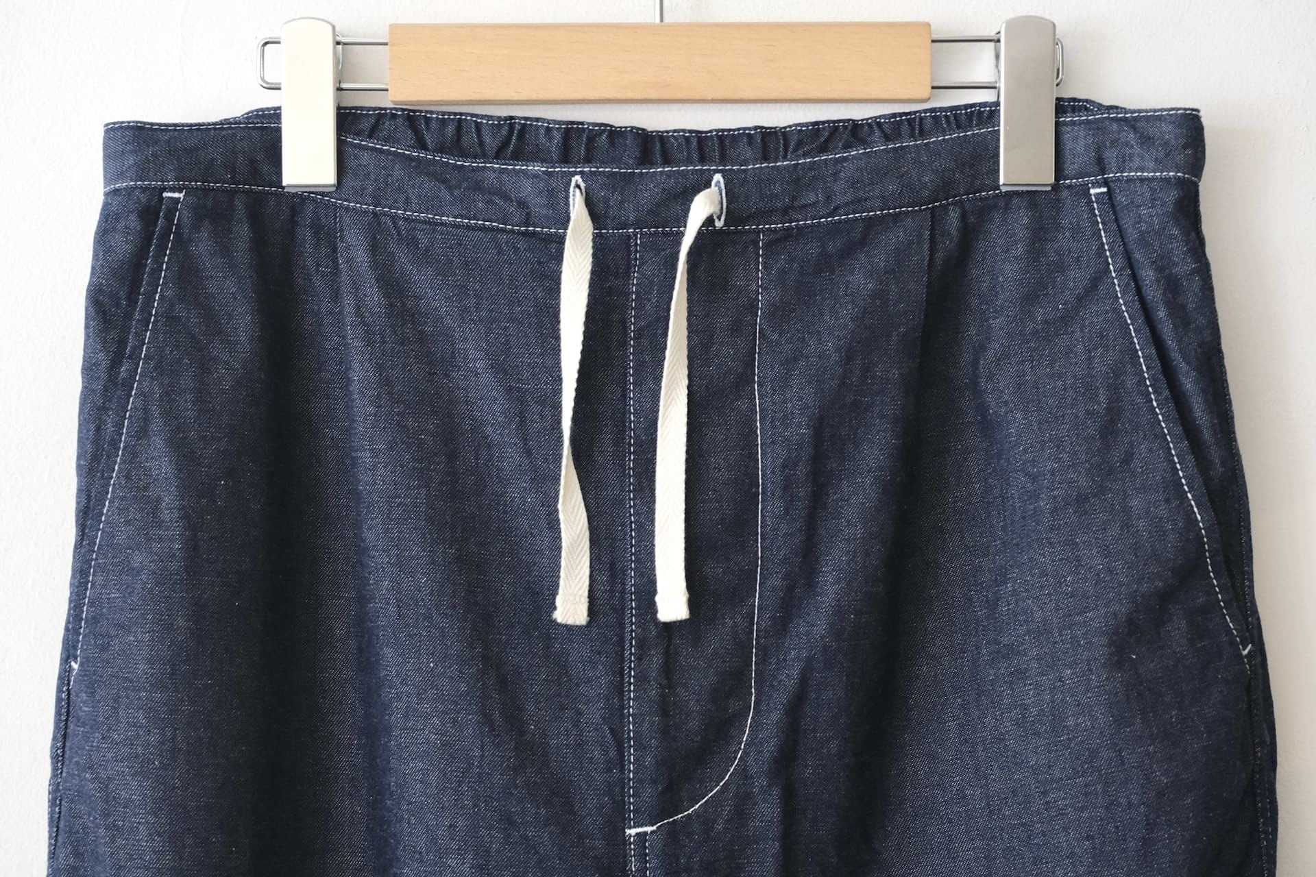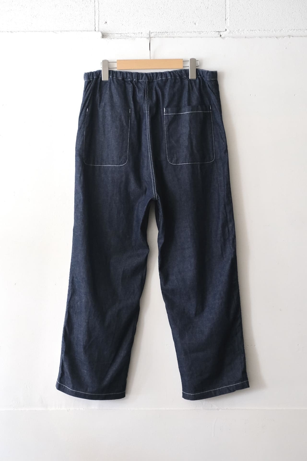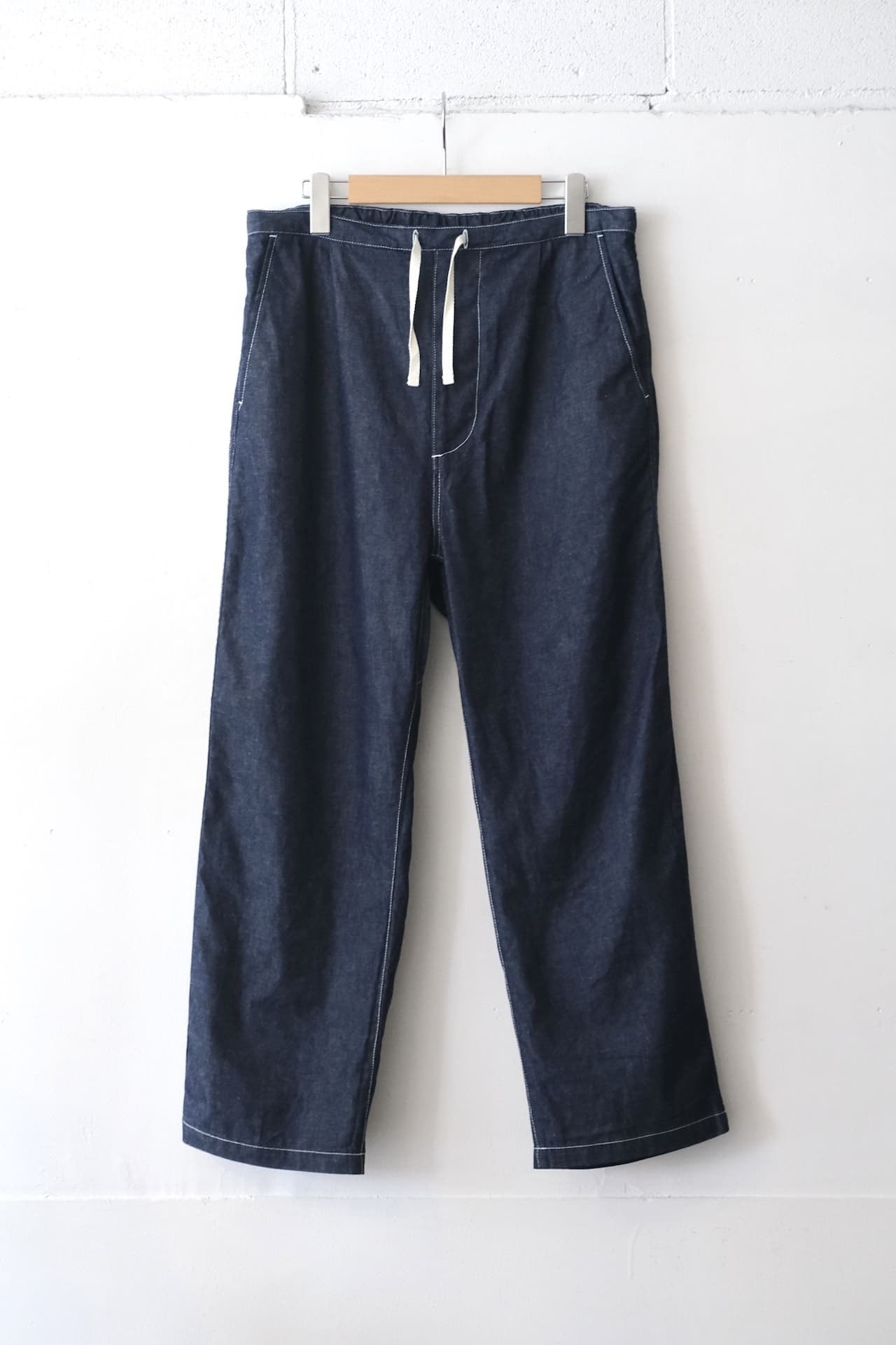 ワタリから裾までがやや太めなシルエットで、腰ヒモ仕様なのでリラックスして穿いていただけます。