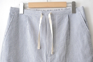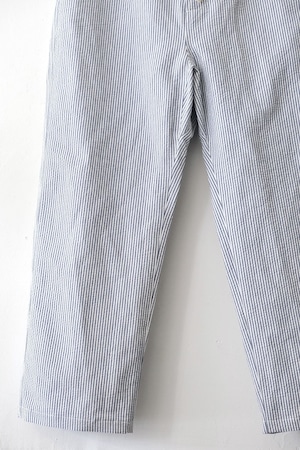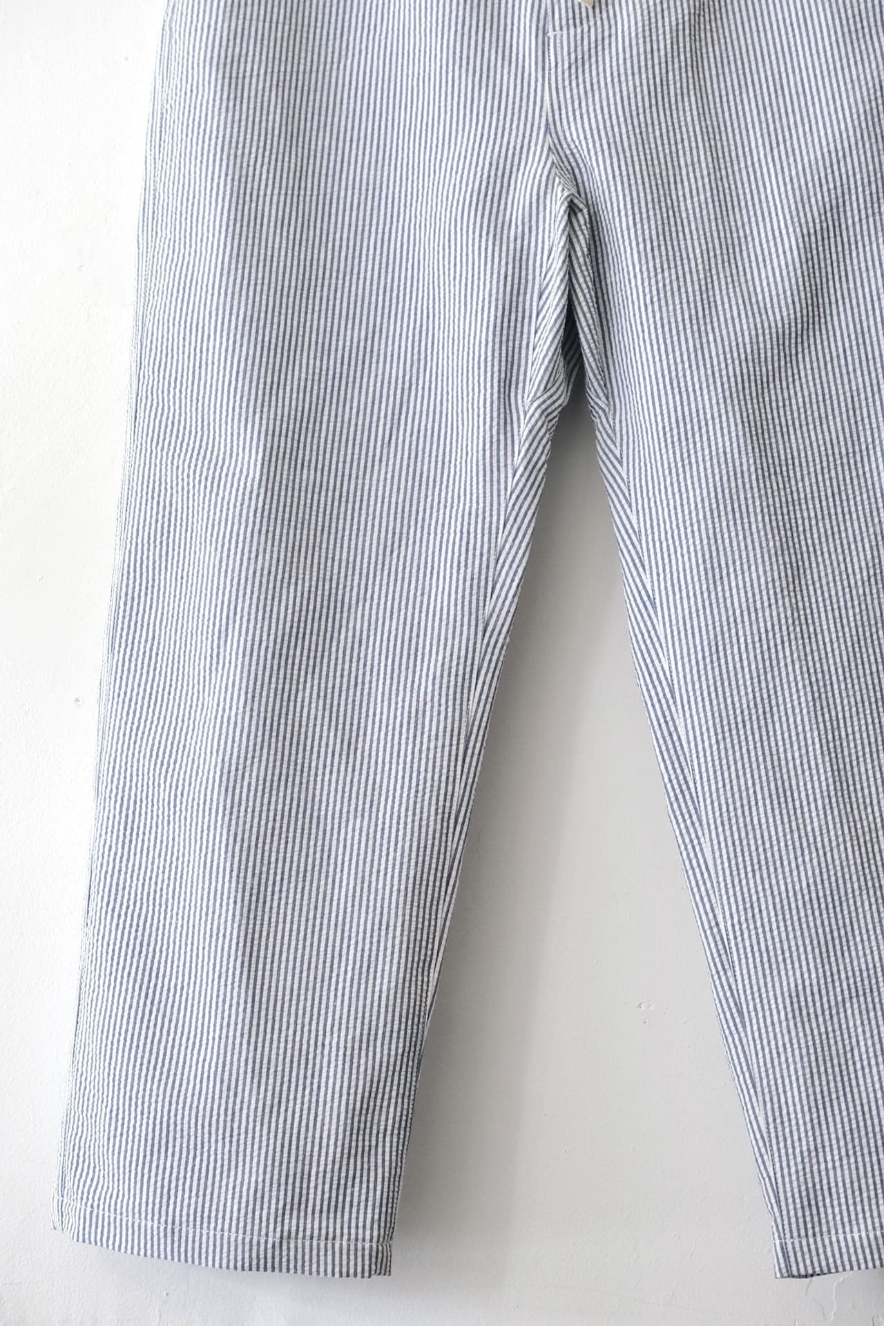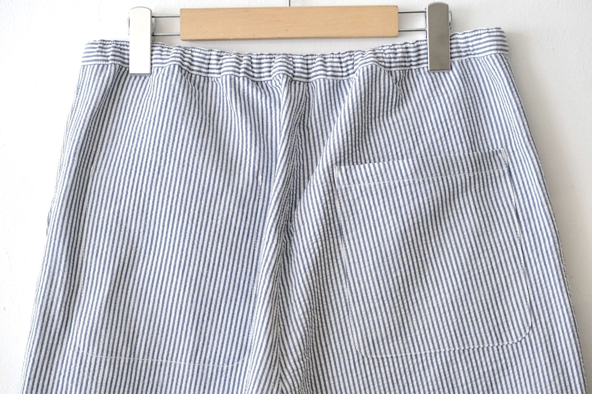 このパンツは、ブルーのストライプにインディゴの糸を使ったコットンとリネンのオリジナルシアサッカー素材が使われています。
