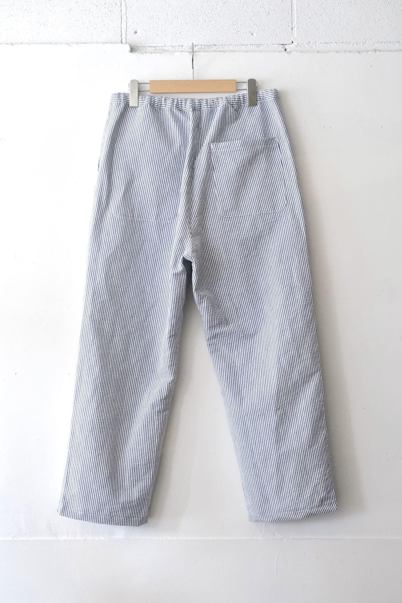 The fabric features blue stripes woven with indigo yarn, using a cotton–linen blend that offers a light, airy texture with subtle depth. Designed with a relaxed, slightly wide silhouette from thigh to hem, they feature an adjustable drawstring waist for easy, comfortable wear. The pants are finished with practical pockets at the front sides, as well as both outer and inner pockets at the back.