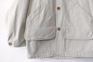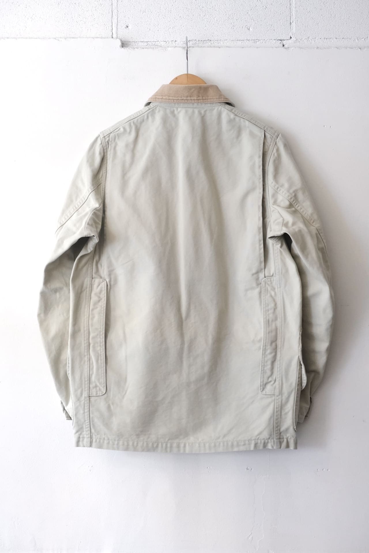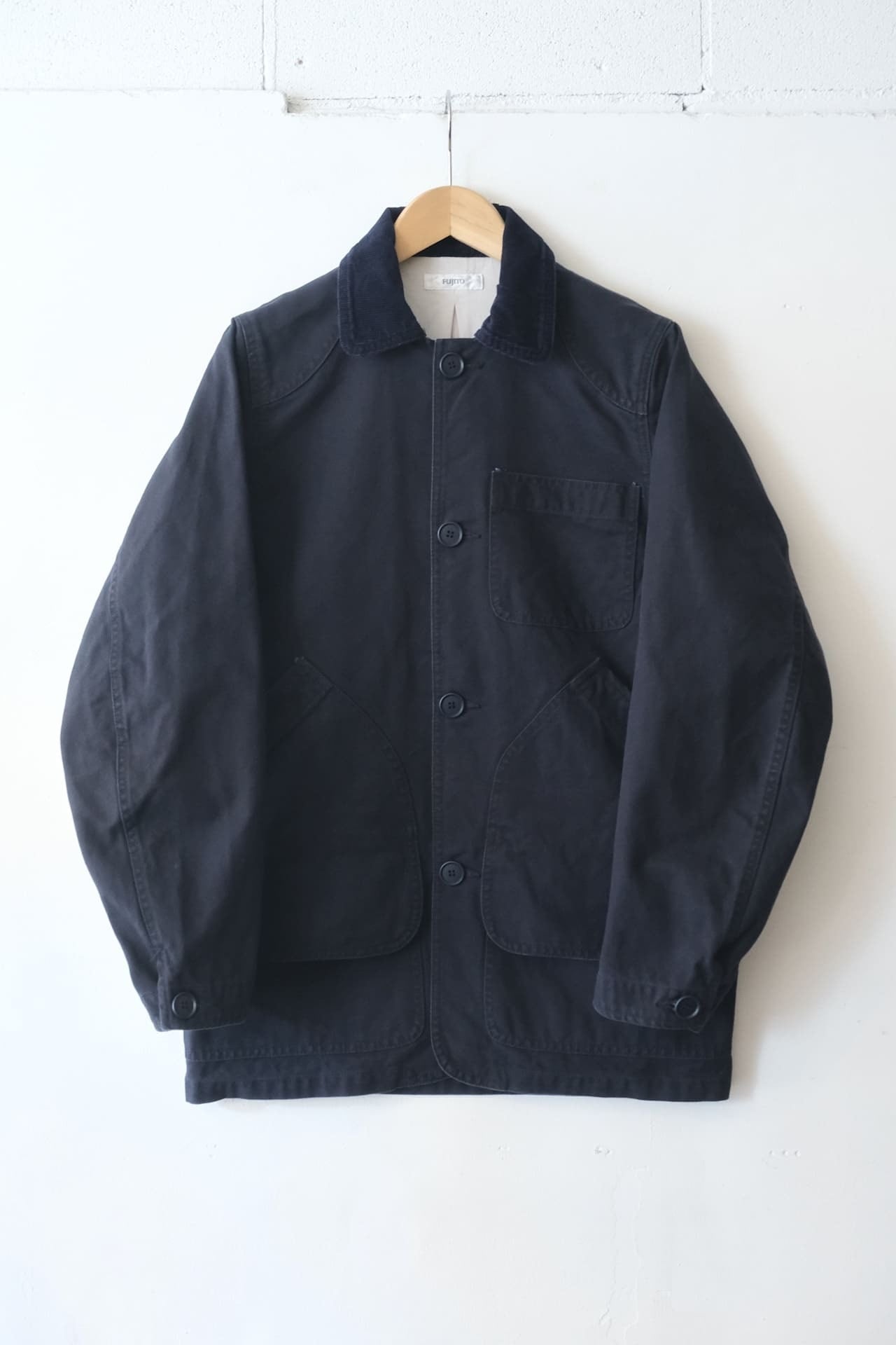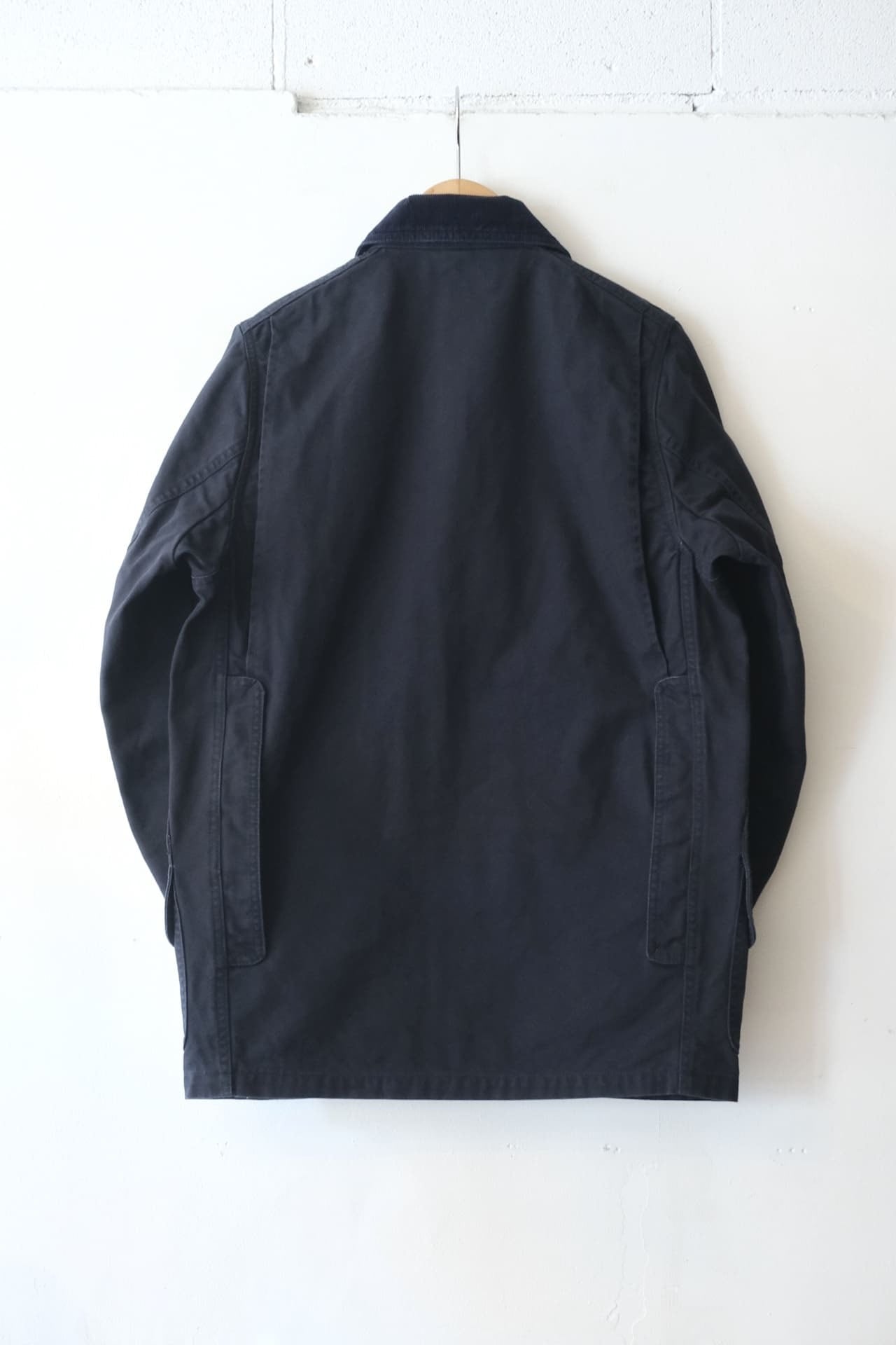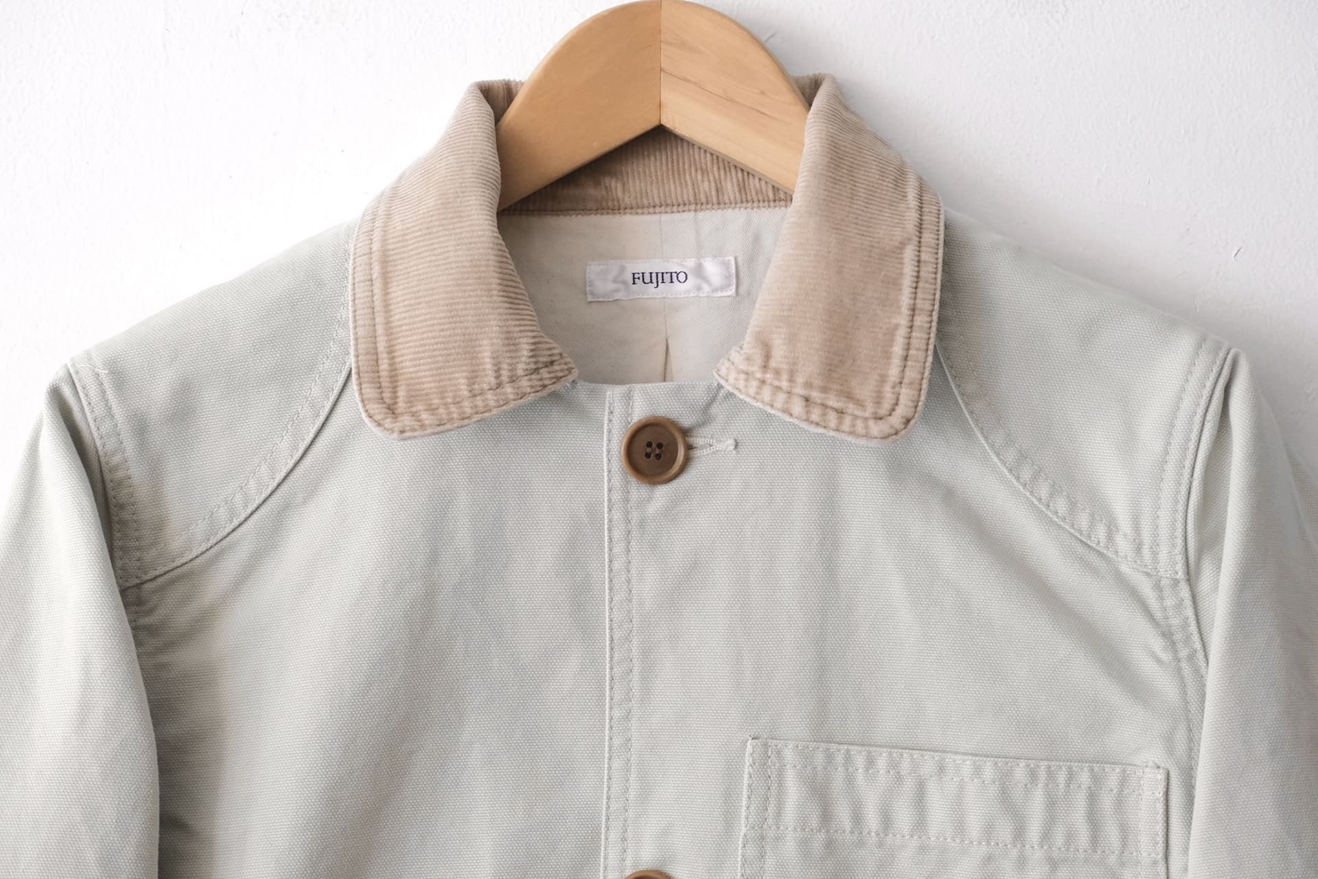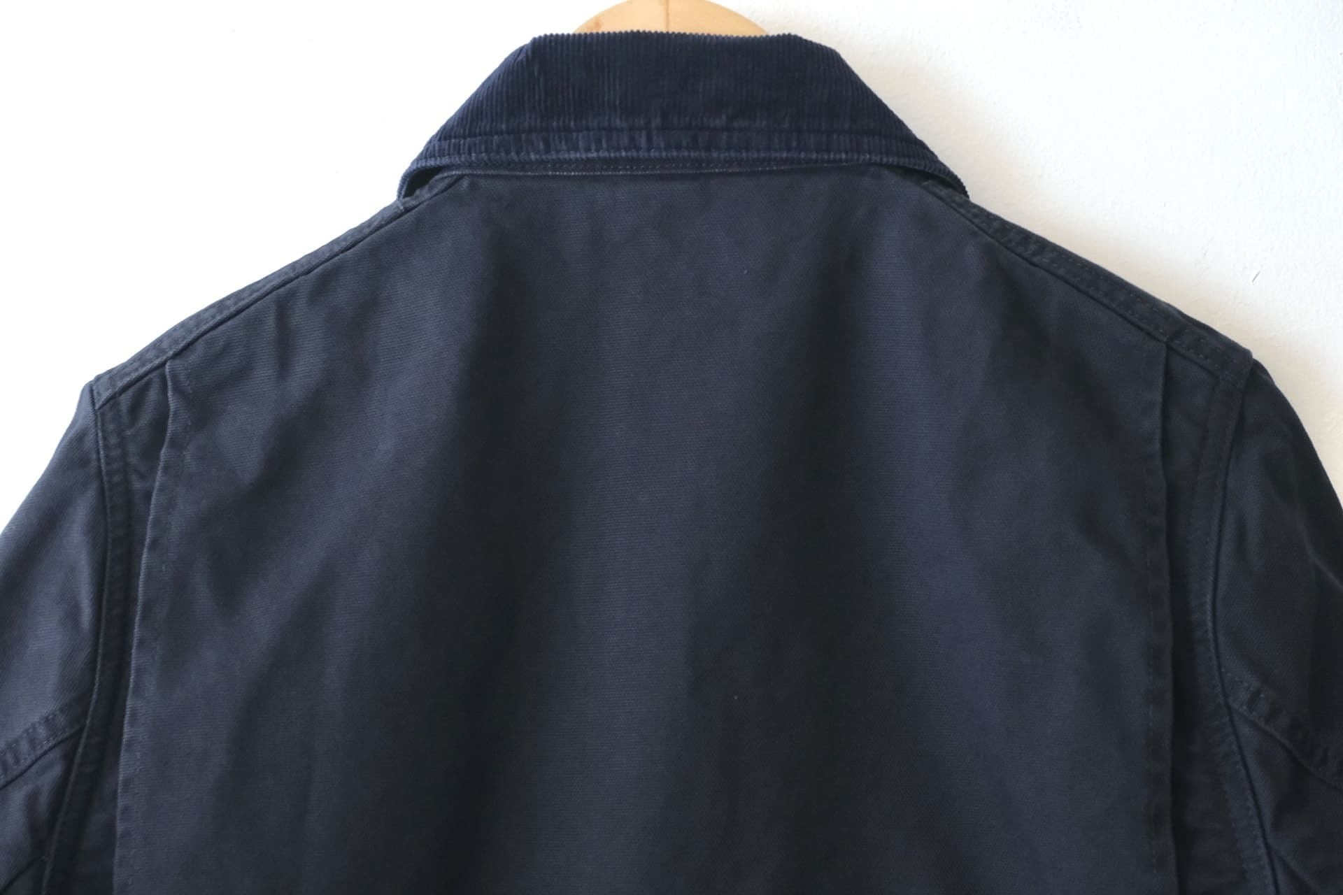 このジャケットは程よい厚みのコットンキャンバスのダック生地を使い、衿部分と袖口裏がコーデュロイ素材を使っているのが特徴です。