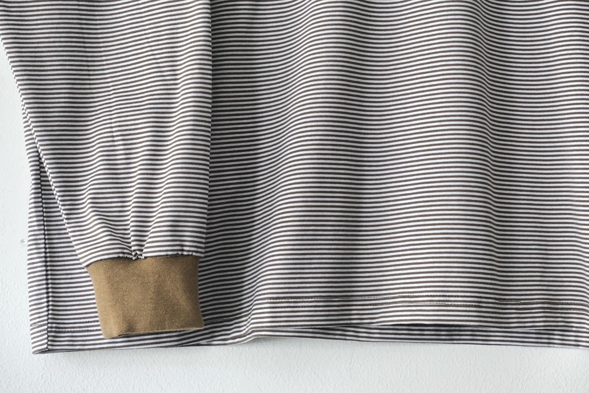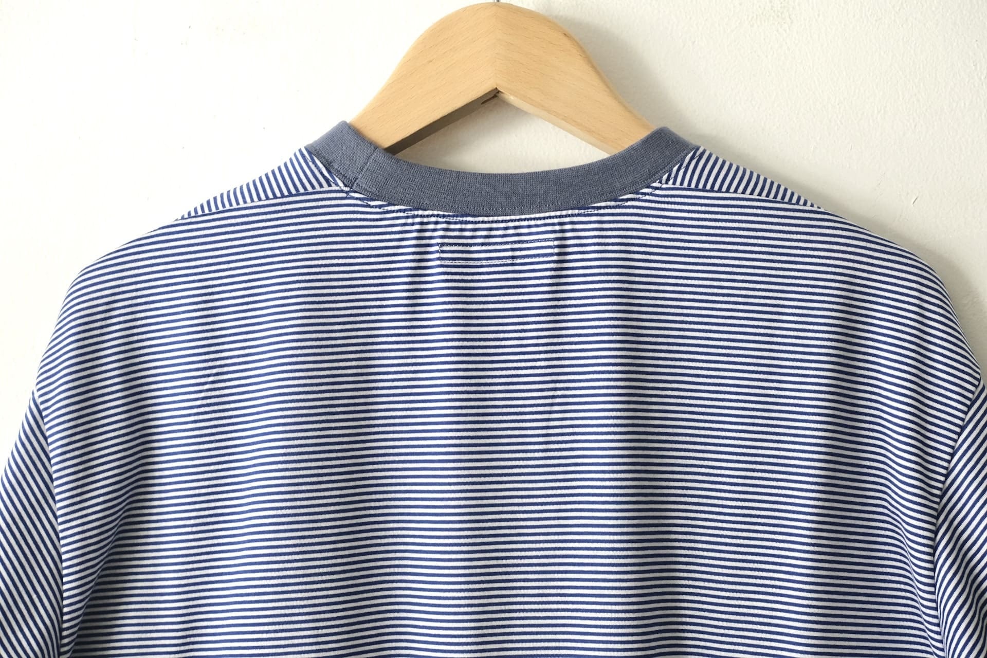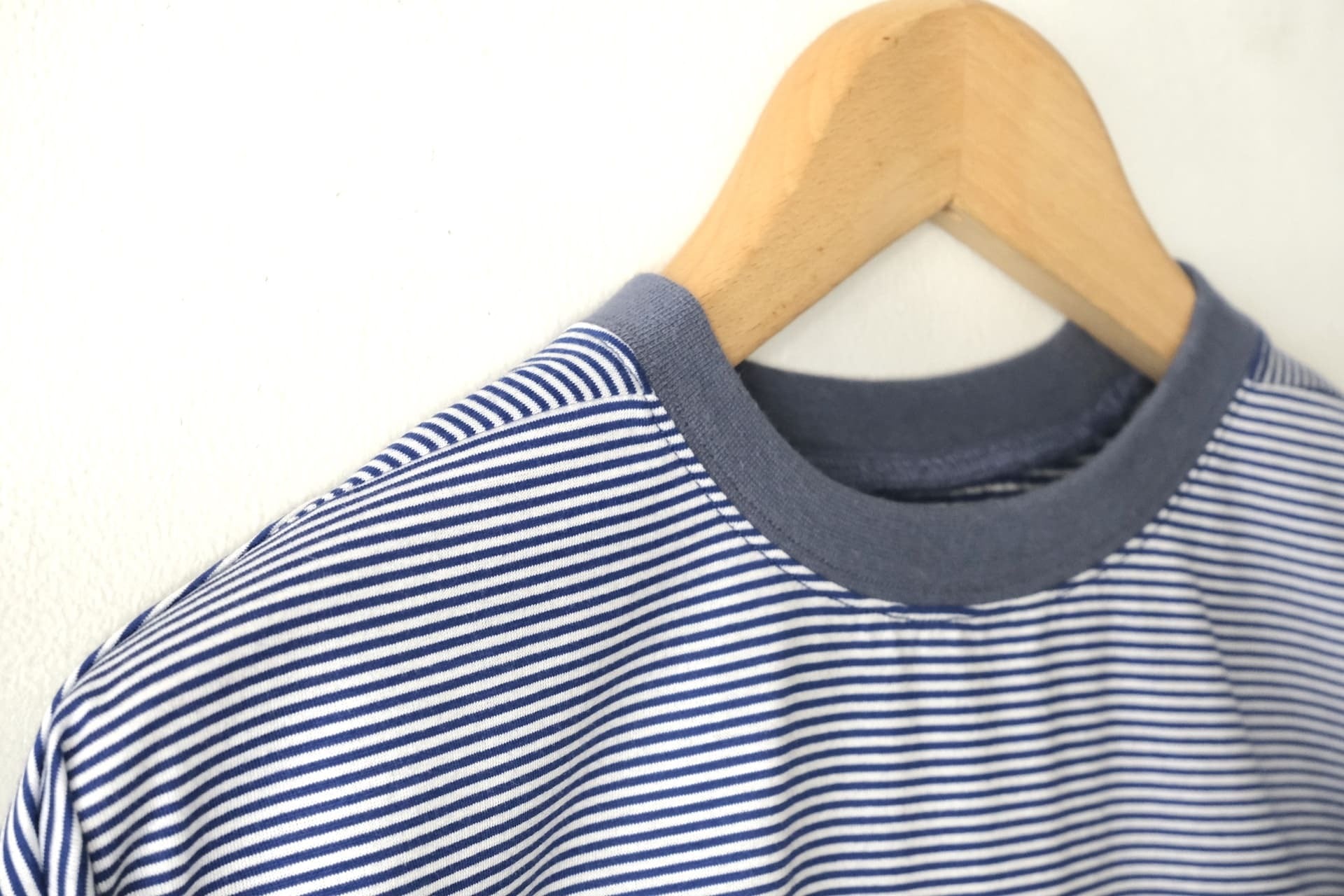 三角形の肩の切り替えが特徴的で、細めなピッチのボーダー柄の1着です。