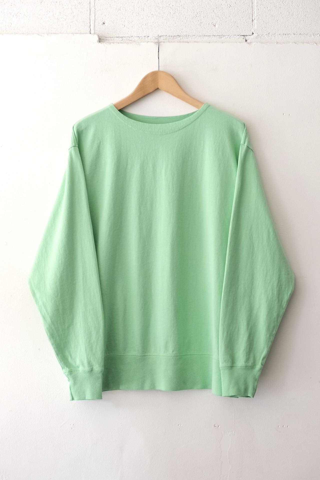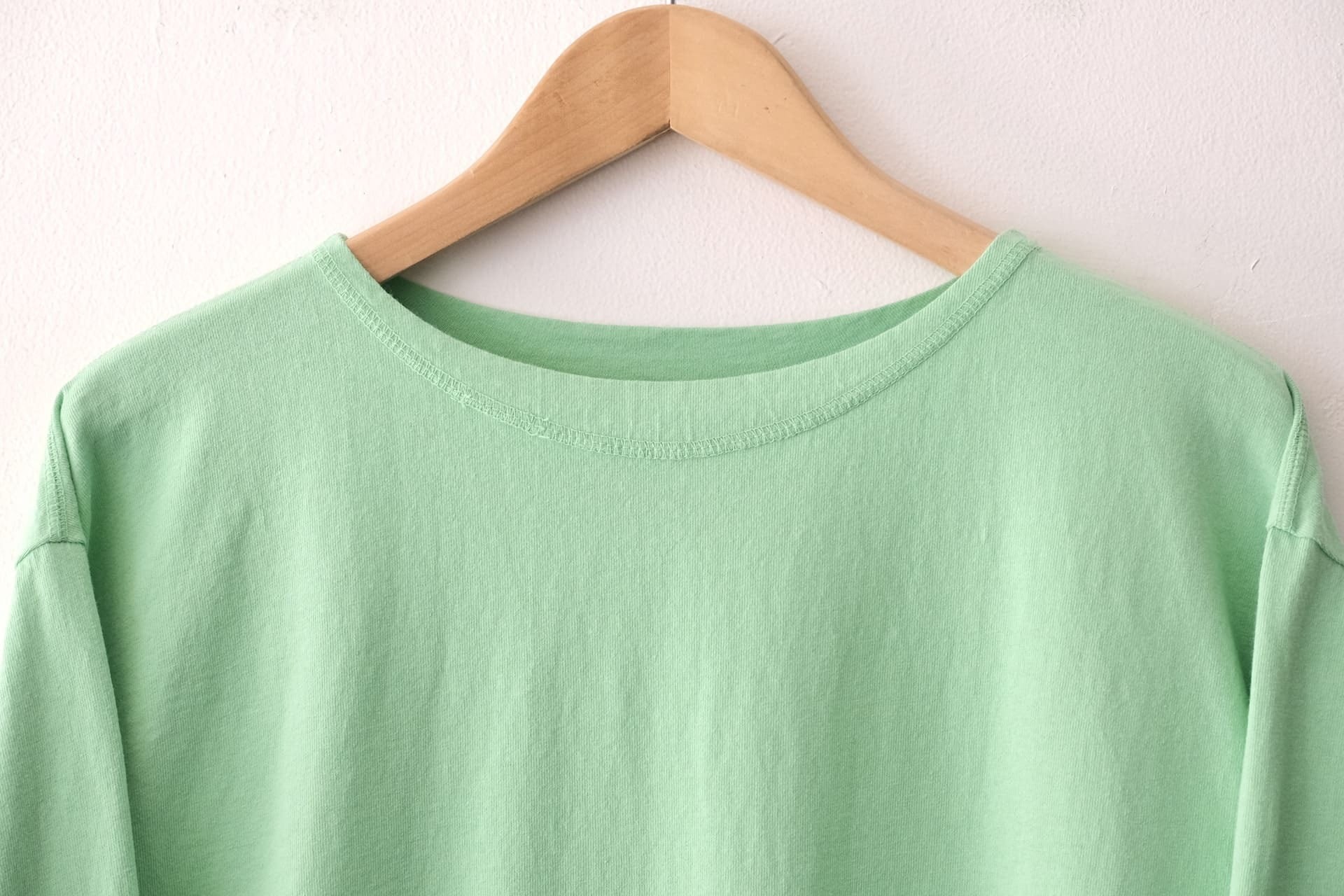 首元は少し広めのボートネック調になっているのでリラックスして着ていただけ、身幅はゆったりで着丈やや短めなので着た時のシルエットも綺麗です。