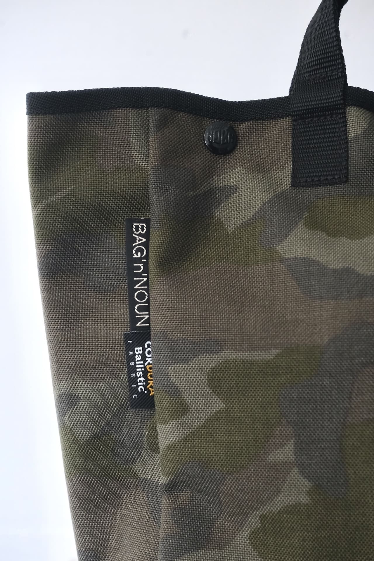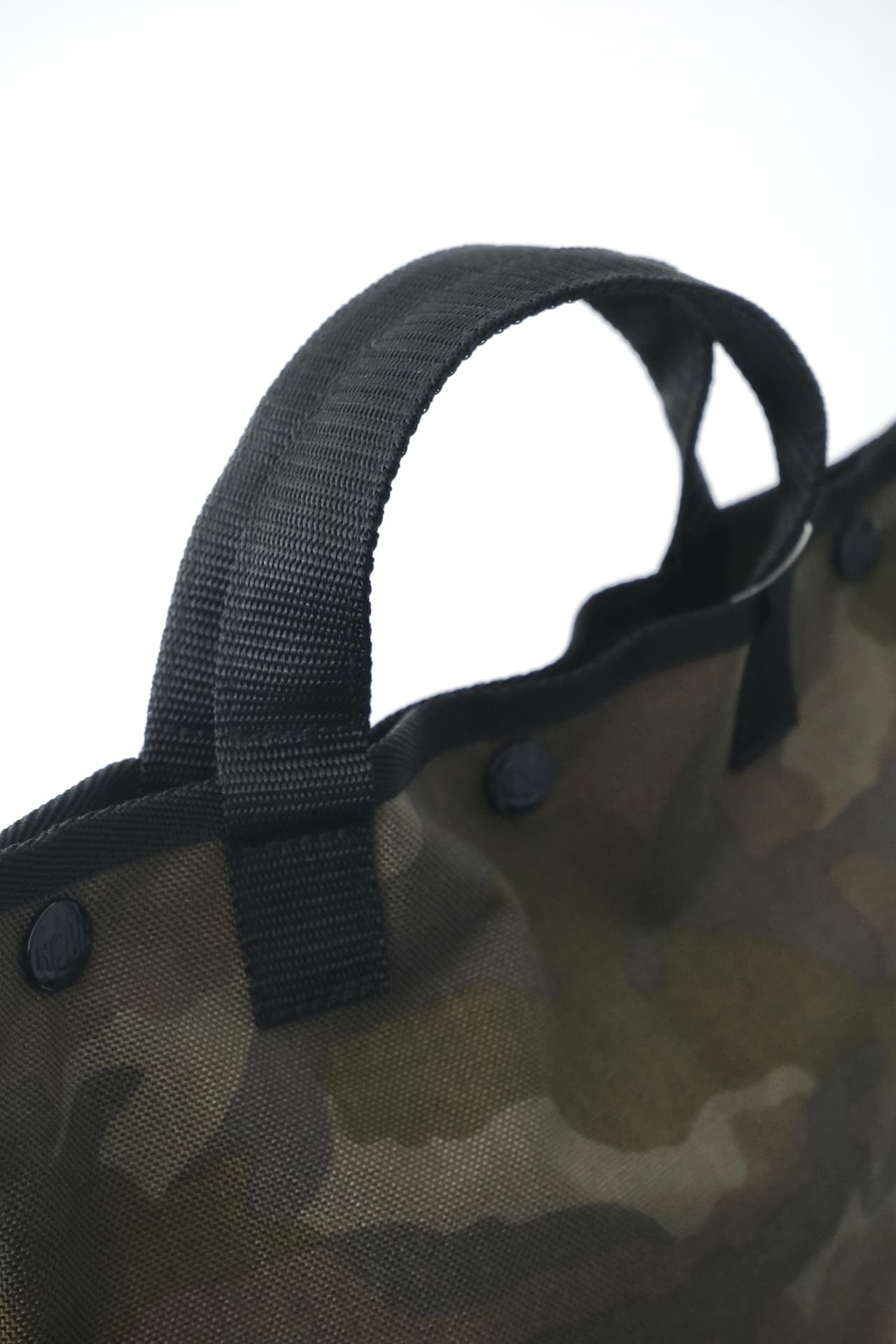 このトートバッグは、コーデュラナイロンを使用した落ち着いた色合いのカモフラージュ柄を使っています。