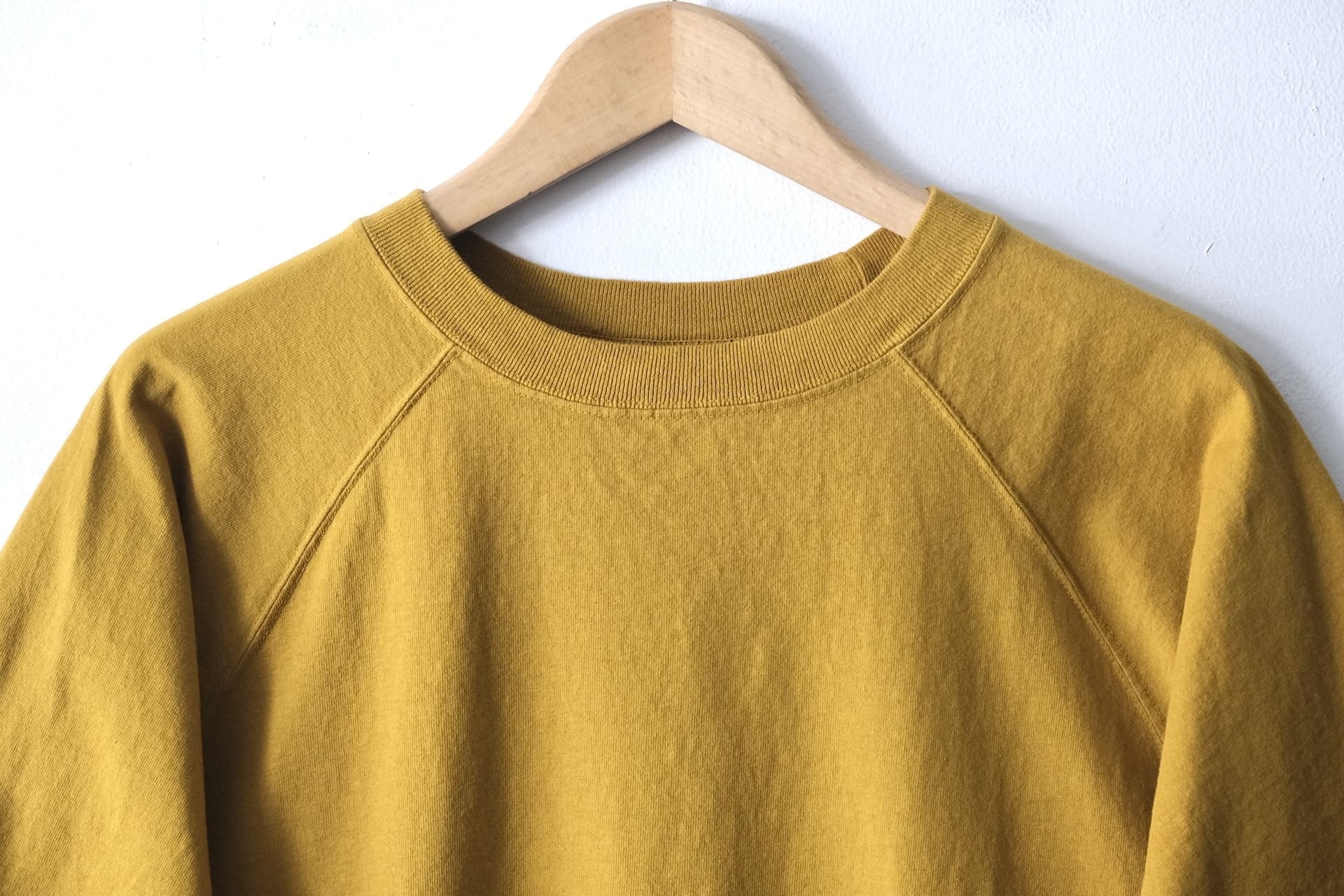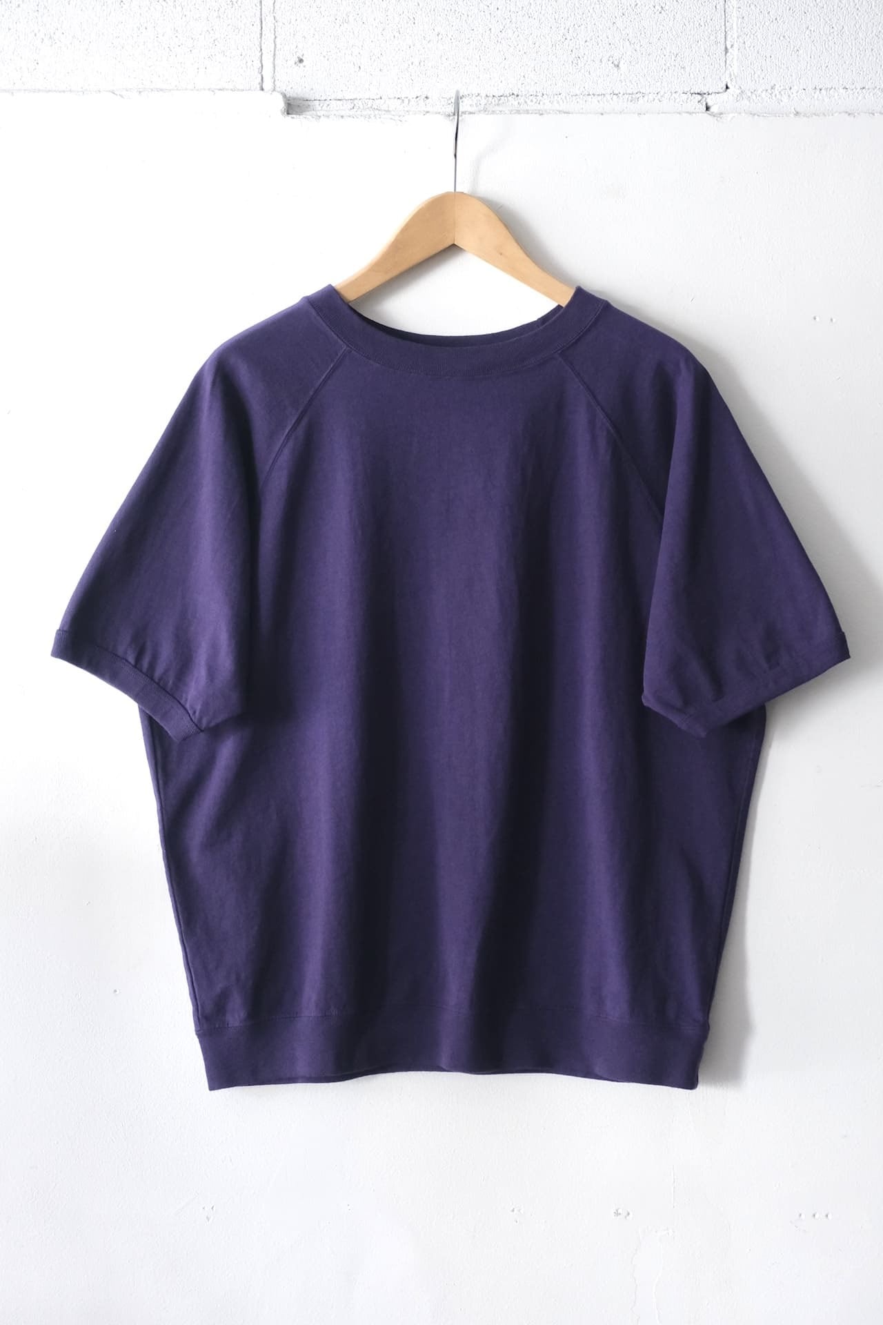 首元はクルーネックのラグランの仕様になり、裾や袖口がリブタイプでスウェットのようなデザインが特徴的です。