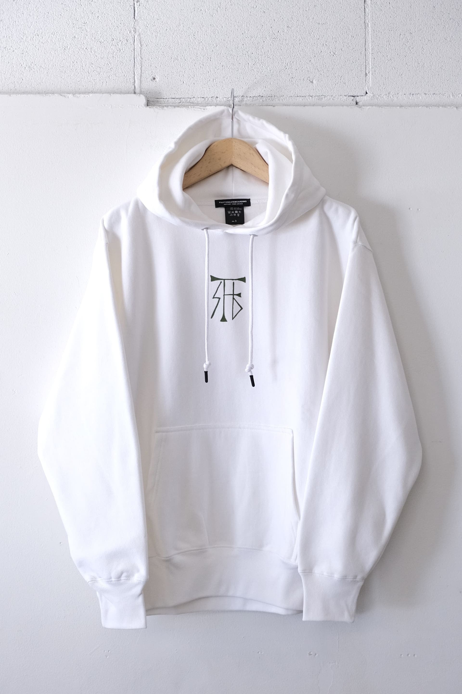 このパーカーは厚みのある12.0オンスのコットンとポリエステル素材のボディを使い、胸中央にオリーブグリーンのFSBのマークがプリントされた1枚です。