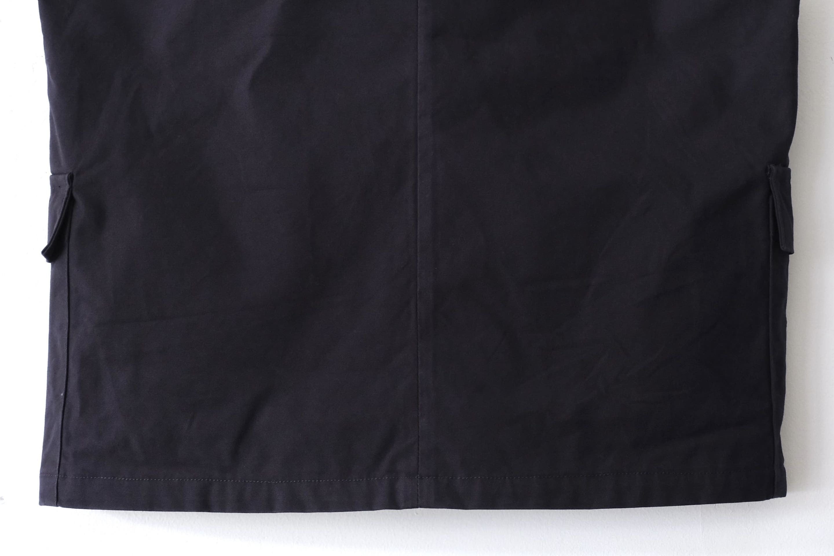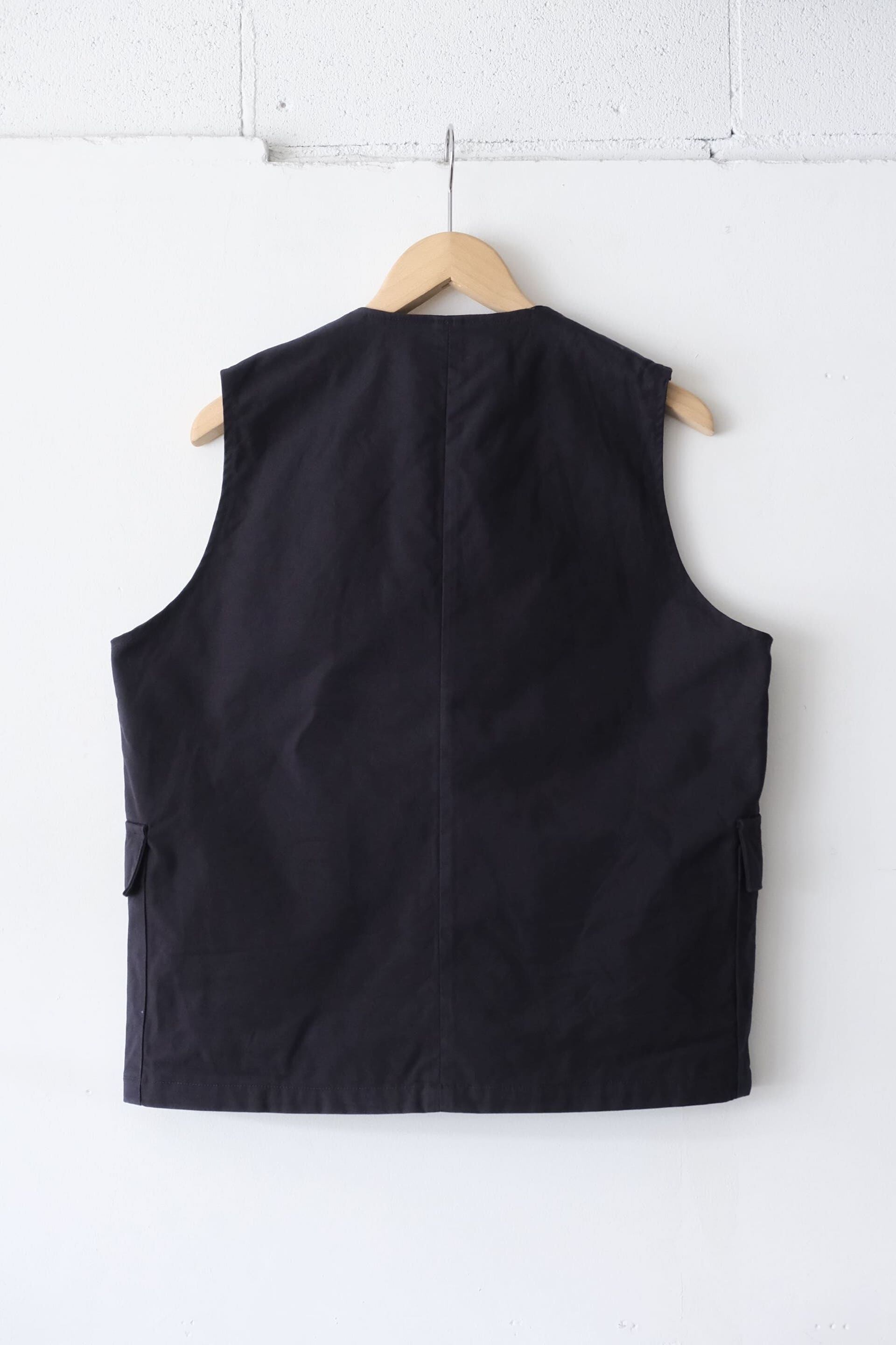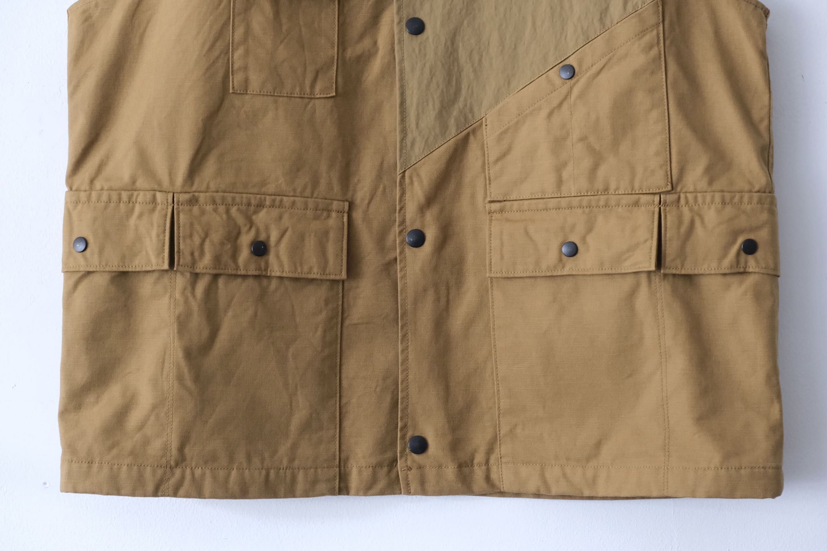 このベストはヴィンテージ感のあるキャンバス素材を使用し、胸位置の切替えにはシワ感のある撥水性のナイロンを使っています。