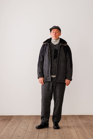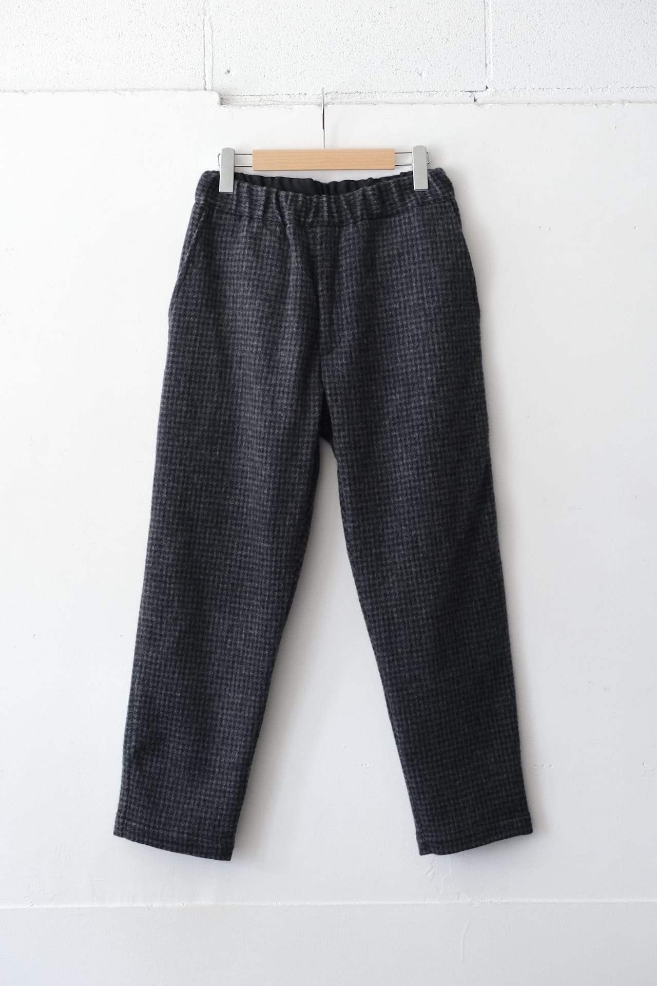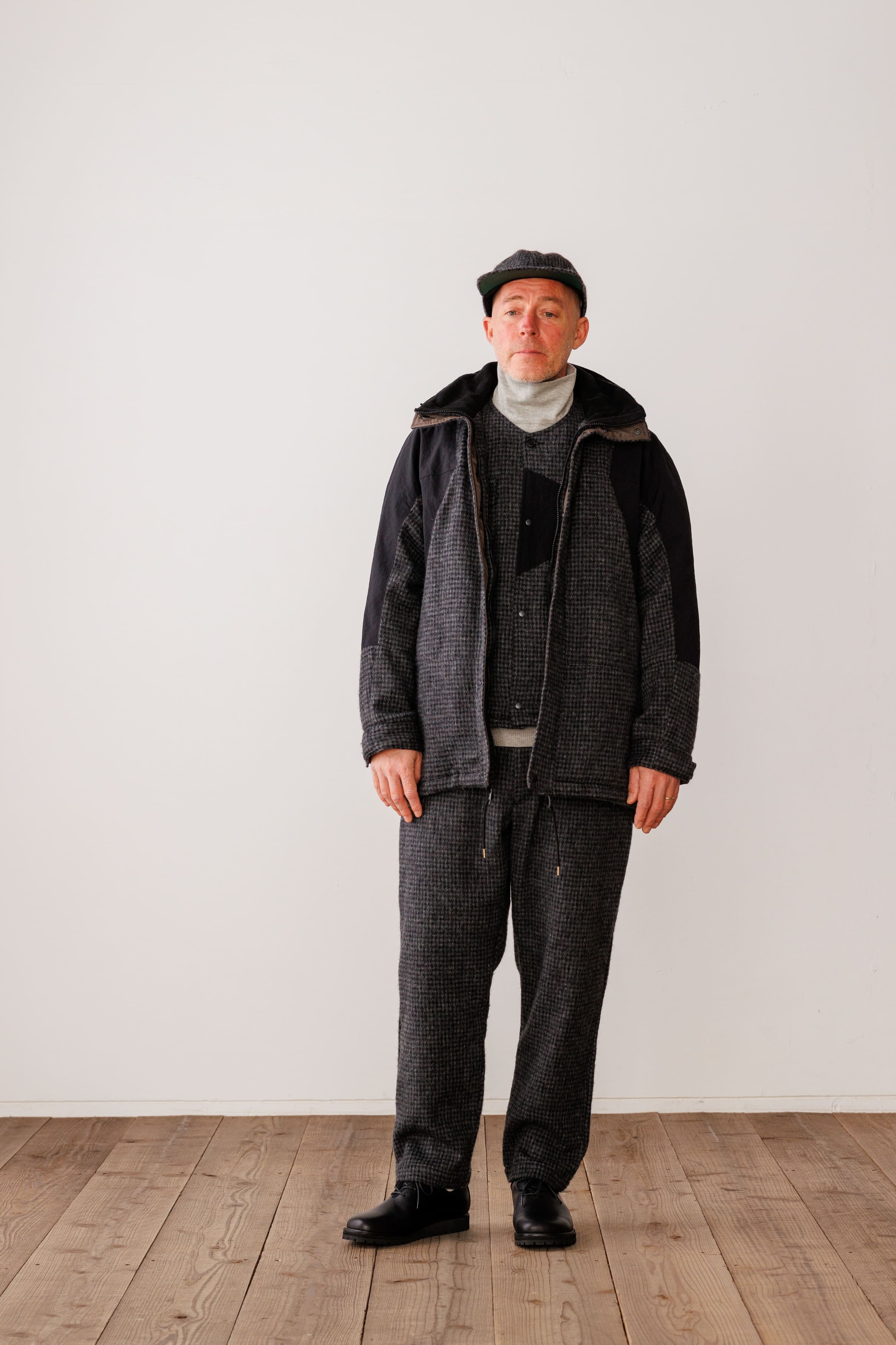 Cut from houndstooth materials with shaggy-fur-touch. Gently and beautifully tapers down from thigh to hem. An elastic waist drawing makes it easy and comfortable to wear. With its warm feeling, we love pairing it with a knit sweater for cold days ahead. The Mountain Parka and the B.B Cap with the same materials as the trousers will be a perfect autumn companion for your autumn outfits.