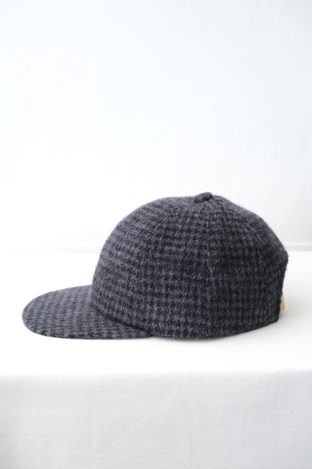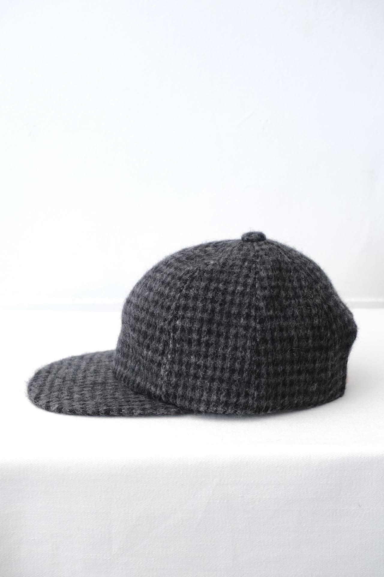 このキャップはシャギーな毛並みのハウンドトゥース柄ウール混紡生地を使っています。