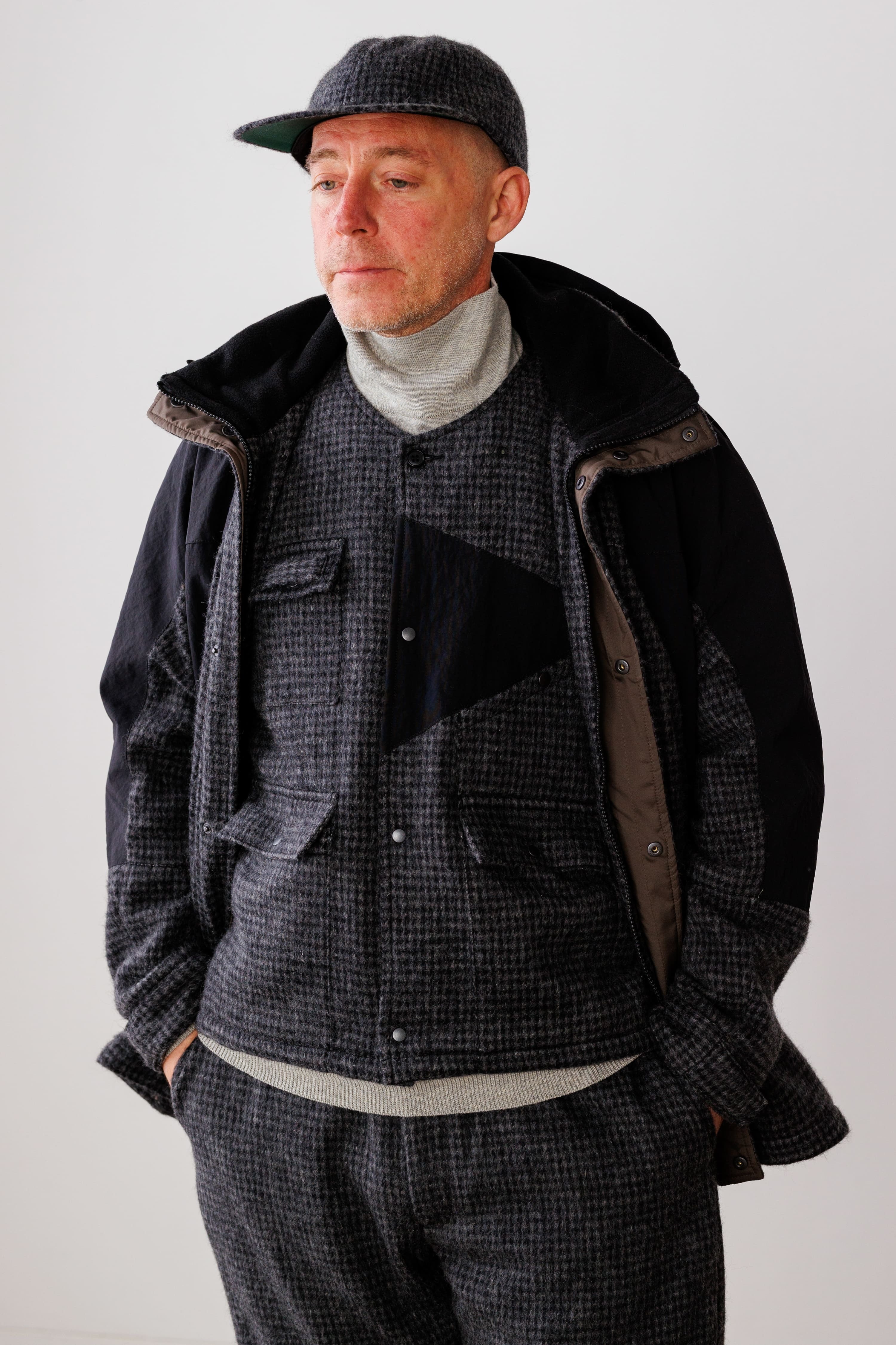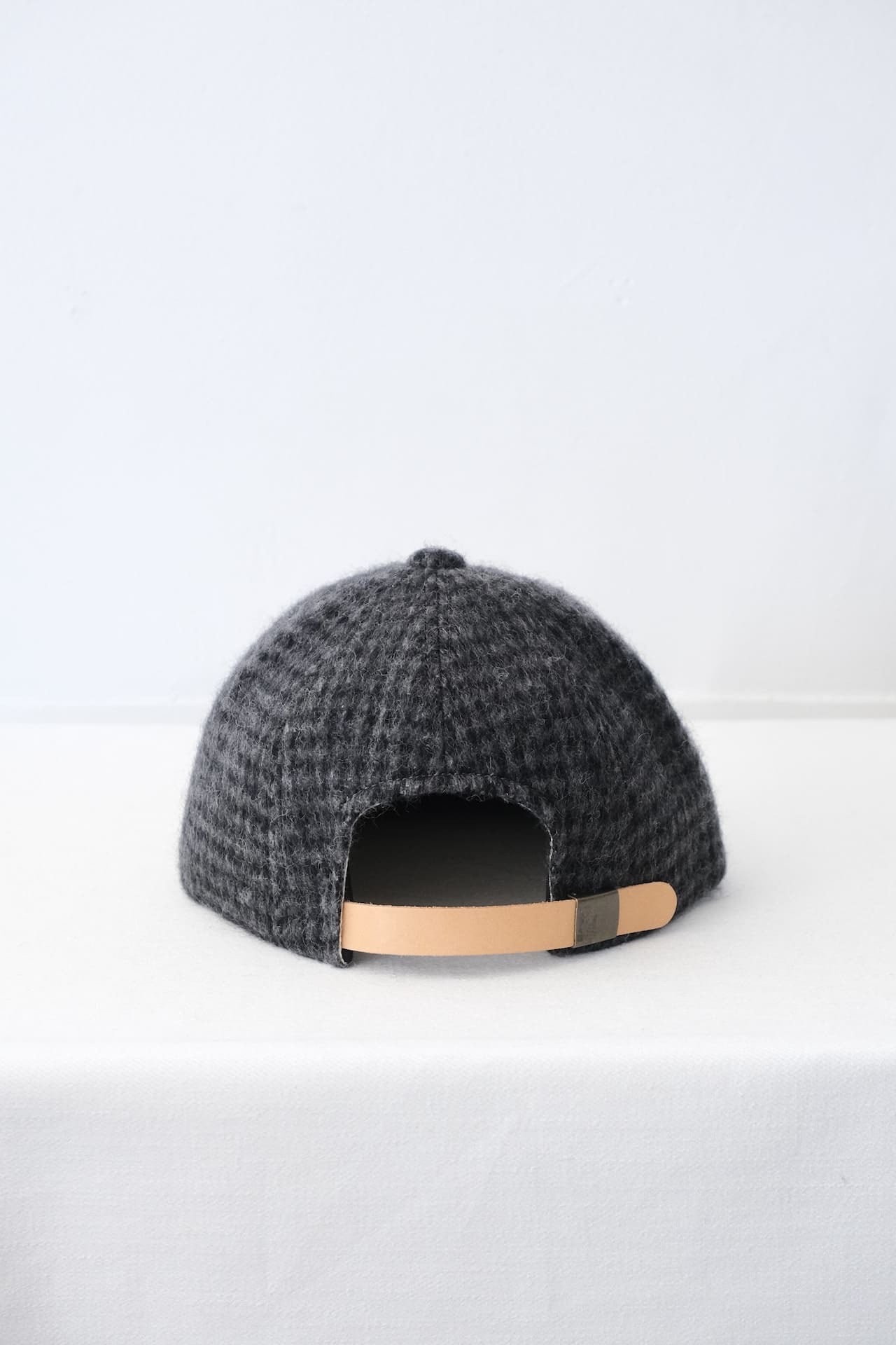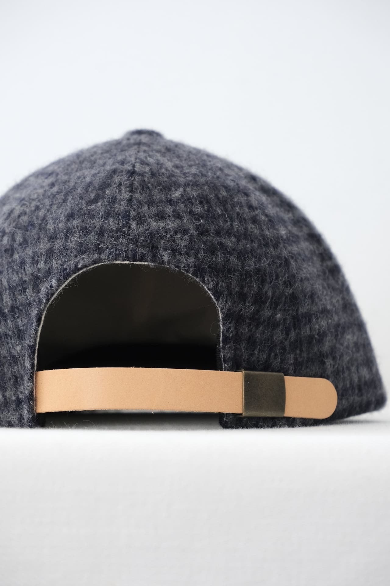Cut from blended fabric wool and houndstooth materials. Detailed with the 8-panel-shallow-fit-shape and the cowhide adjustable back strap. It has a warm feeling and check patterns will keep the focus on it for your understated A/W outfits. We also love pairing it with the same materials of our Mountain Parka or our Hunting Gilet.