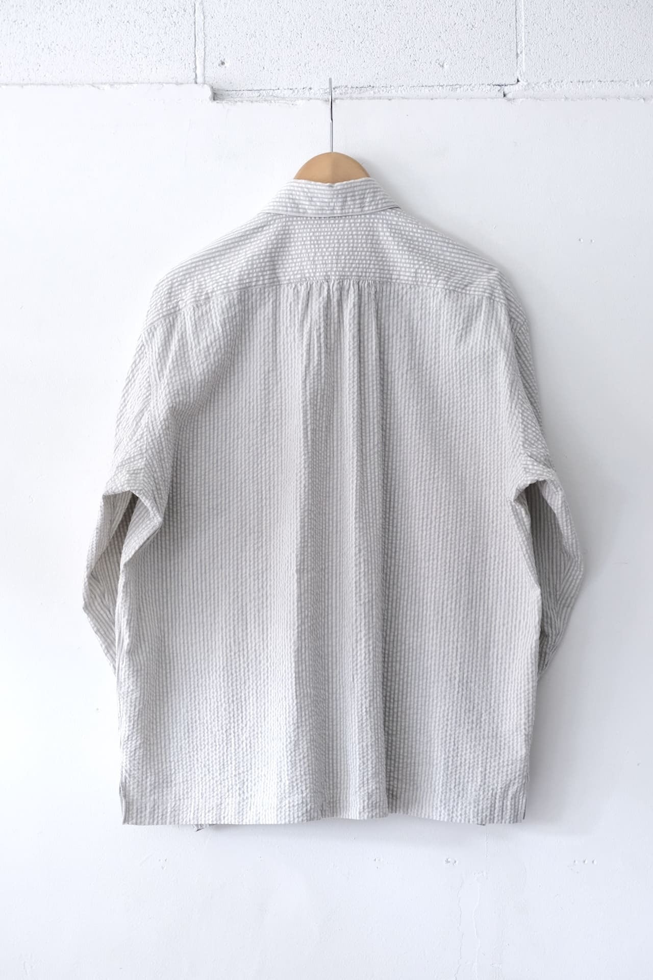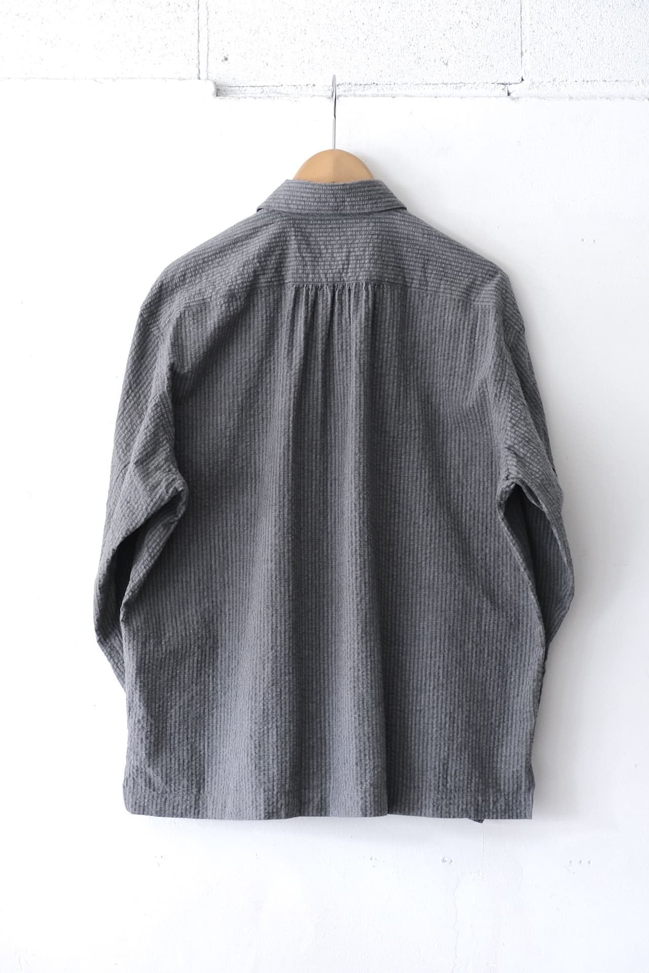 このシャツジャケットは、生地に表情があるシアサッカー素材を使用しています。