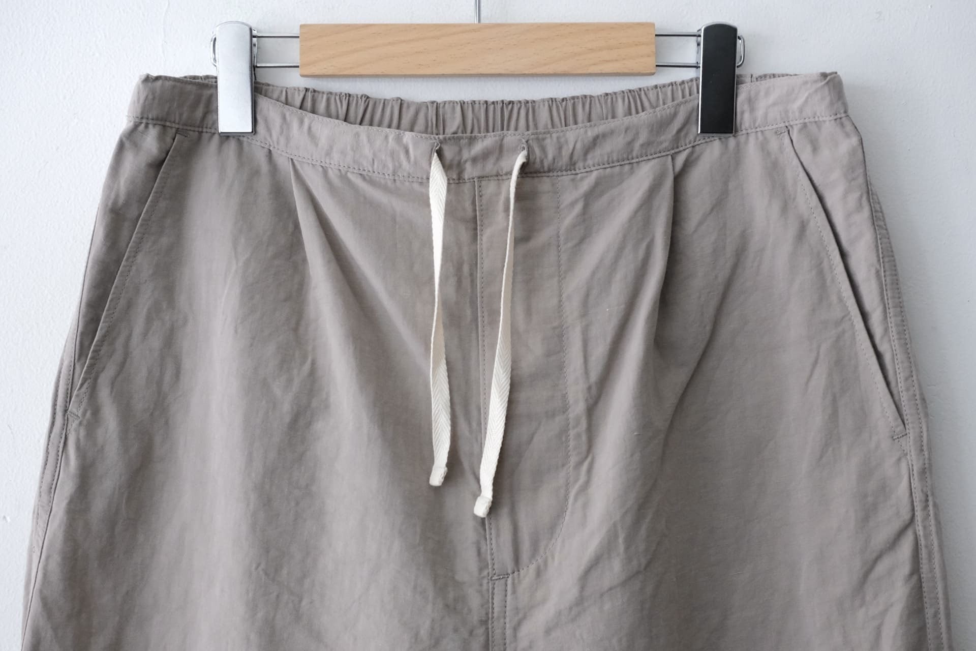 このパジャマパンツはリネンとコットンとナイロンのウェザー素材を使い、ワタリから裾までがやや太めなシルエットの1本です。
