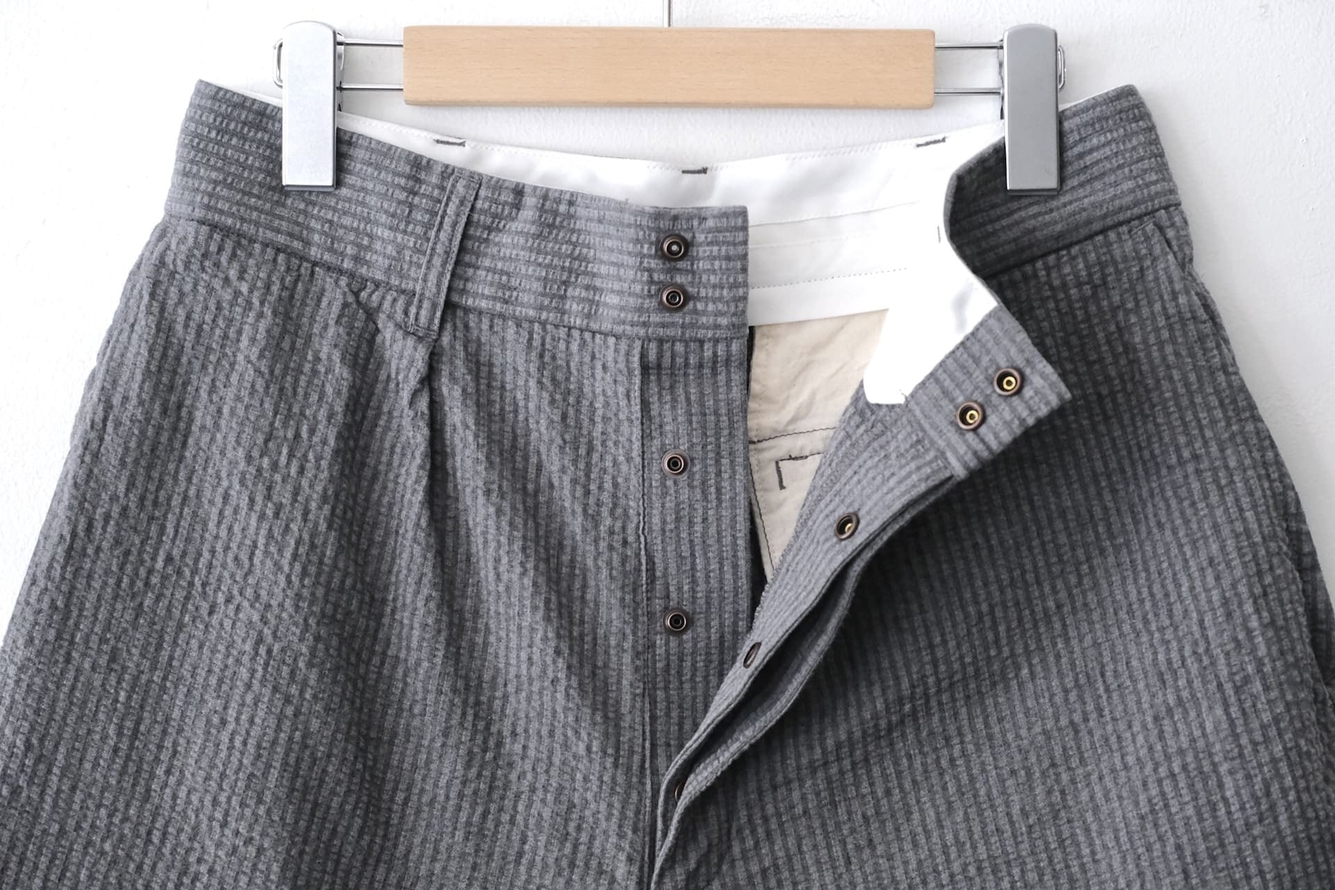 Cut from a breezy-airy-seersucker cloth. Detailed with a relaxed fitting shape, easy and comfortable to wear. Featuring the one tuck and the front snapped buttons and left-back-pocket has a snap button too. A perfect pairing with a low-key-style-t-shirt or our Shirt-Jacket or our Fatigue Shirt with the same materials.