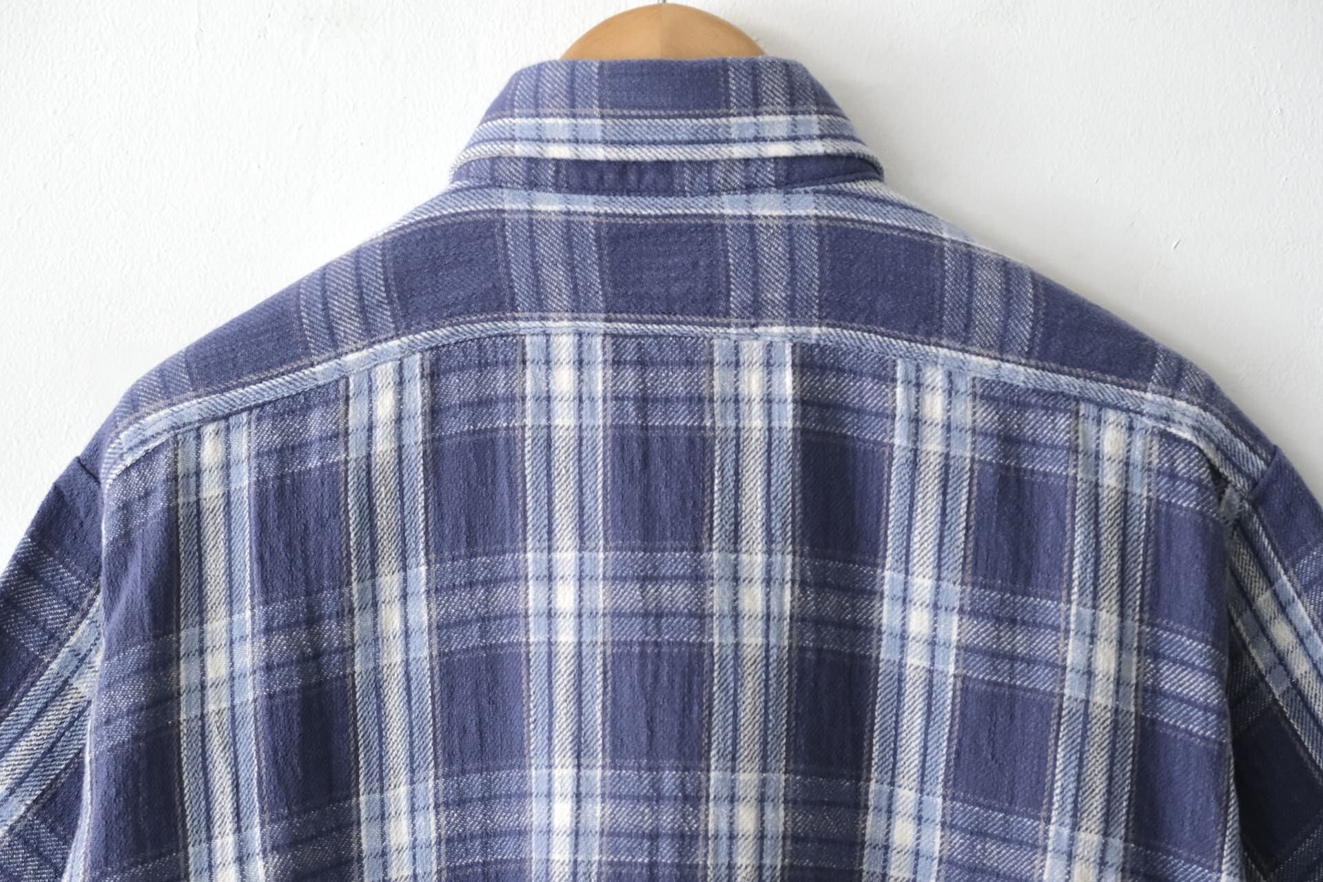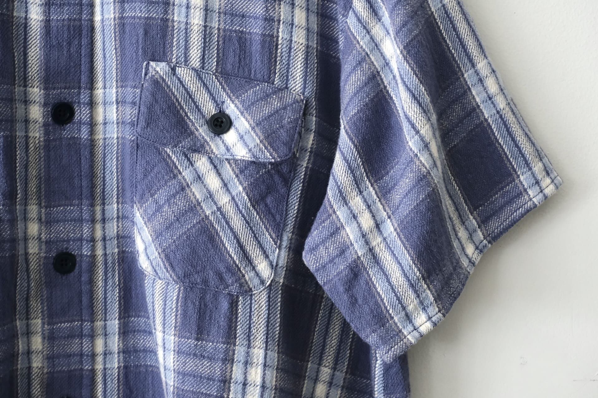 Cut from a flannel fabric with a lightweight-soft-touch feeling. Detailed with a relaxed fitting shape, easy and comfortable to wear. Featuring the flapped-chest-pockets, hems and cuffs are sewed by an interlock technique. More you wear, the more you add another flavor of an aging layer. This refreshing blue-stripe shirts will be a perfect combination with white-tone trousers or shorts for summer.