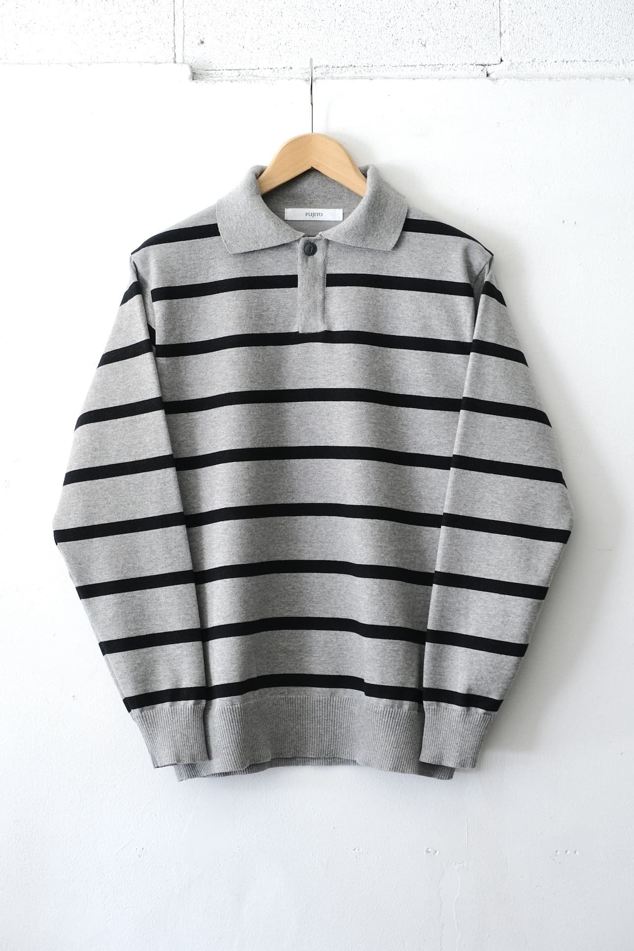 Cut from blended fabric with soft cotton and polyester. Featuring the oversized collar and front placket with a winged style except for the top button. Inspired by a rugby shirt that David Hockney would wear, we have made it into a knit sweatshirt with FUJITO’ style and design philosophy.