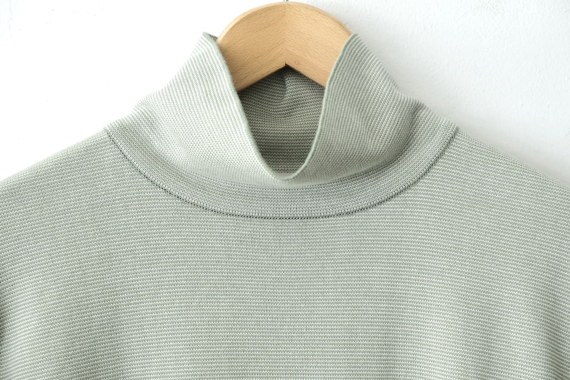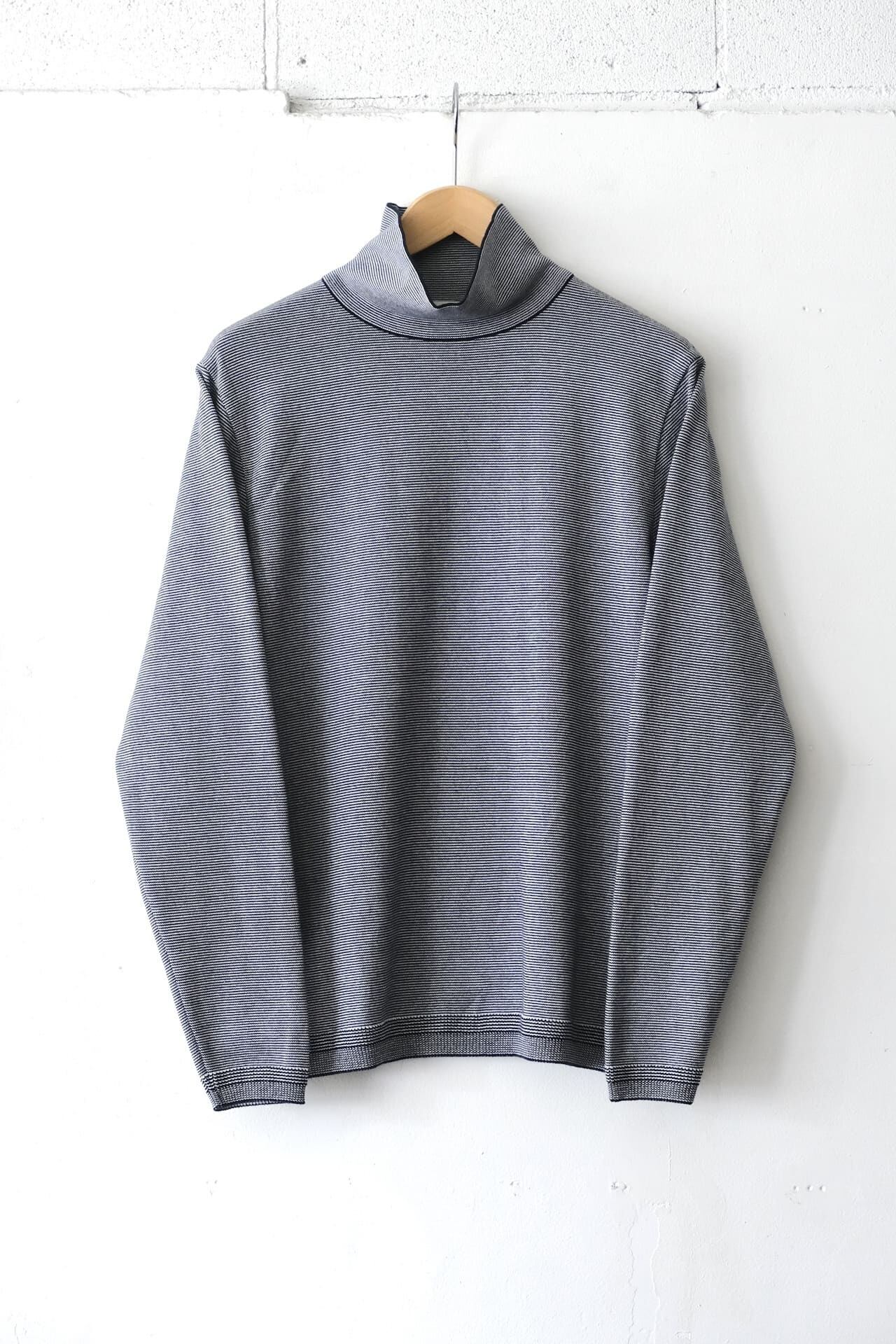 このタートルネックニットTシャツはコットン100%で肌触りが良く、非常に細かいボーダー柄が特徴的です。
