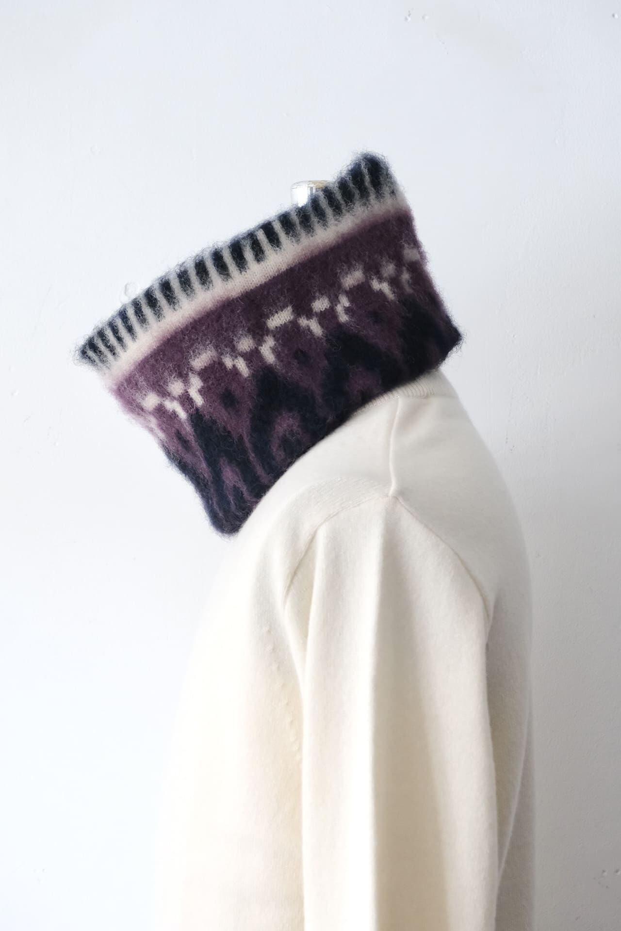 このネックウォーマーはウール100%のジャガード織で作られていて、表側は起毛加工を施し温かみのある雰囲気に仕上がっています。
