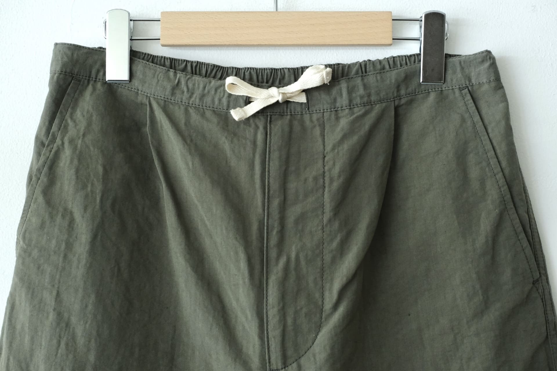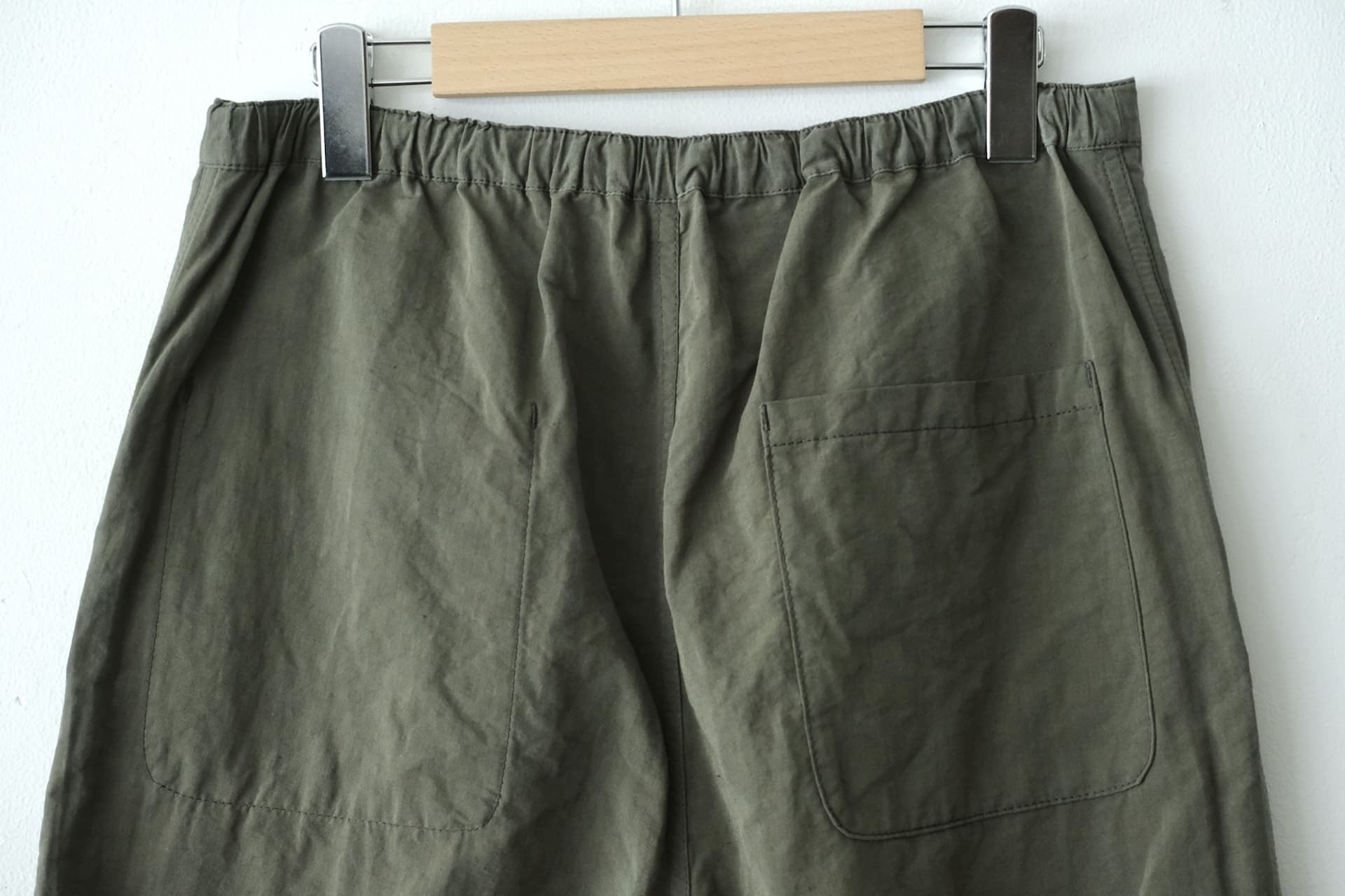 このパンツは、少しドライな肌触りのリネンとコットンとナイロンのウェザー素材を使っています。