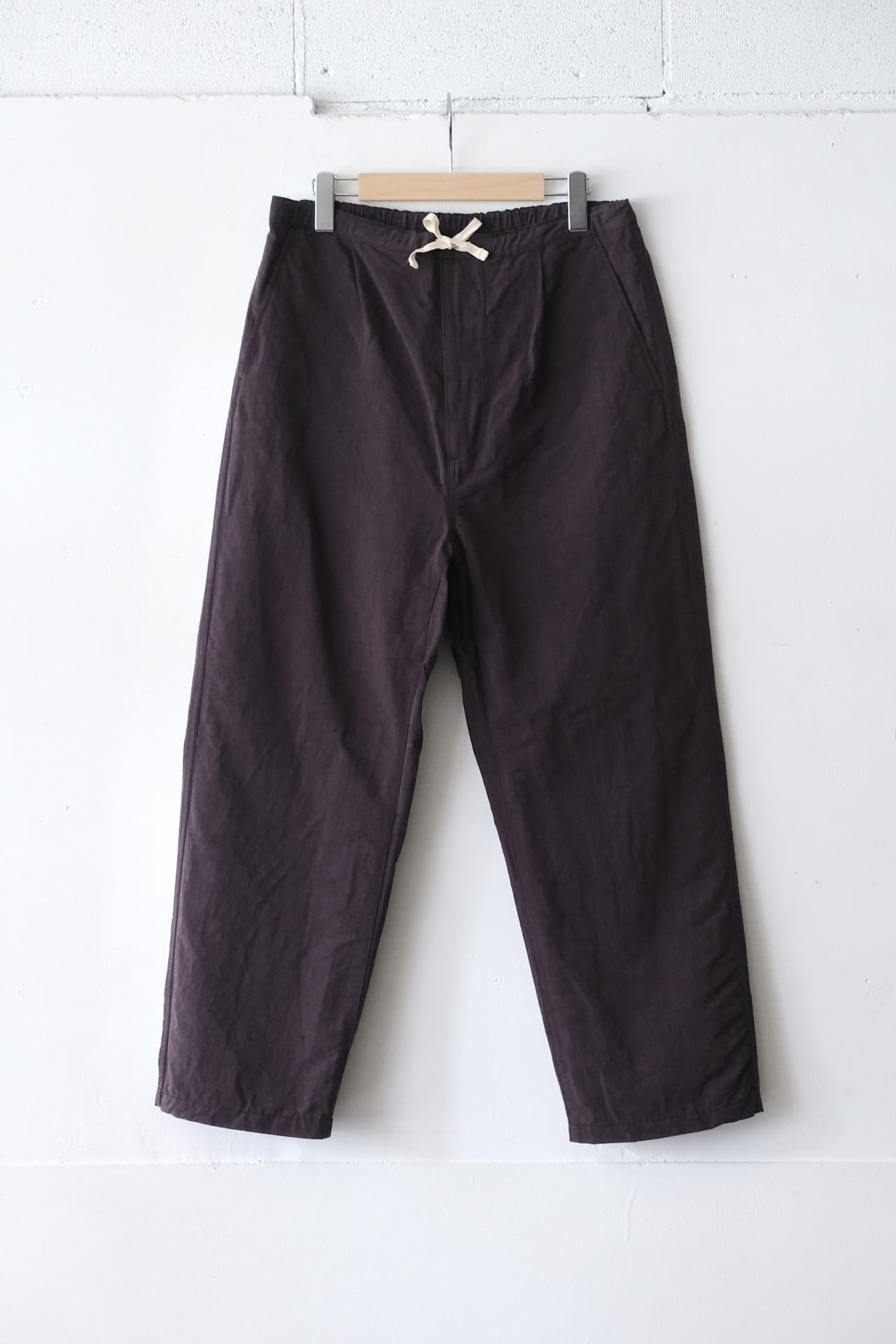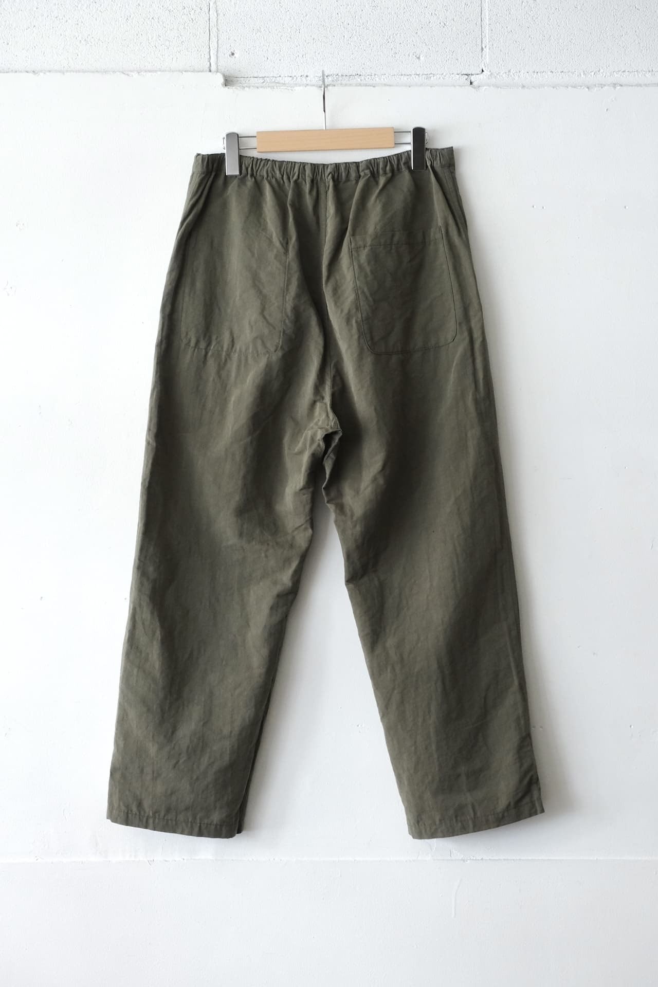 Made of linen, cotton and nylon weather clothes. Slightly dry feeling, well-travel-wrinkles give it a vintage feeling. Wide silhouette style, easy and comfortable to wear with waist-drawing strap. Pockets on the front-side, outside and inside of the back. The Ring Shirt will be a perfect combination with these pants.