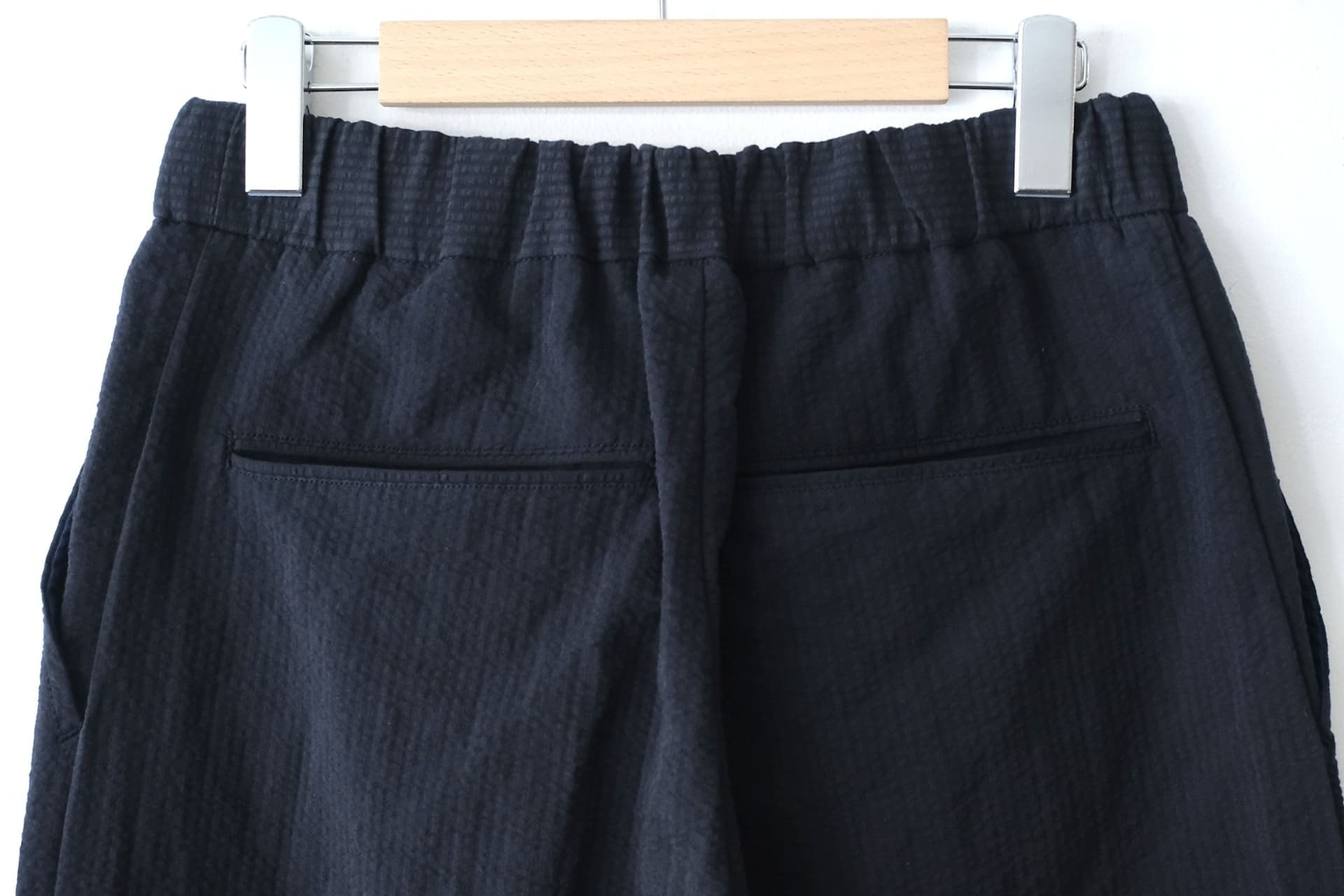 このパンツはオリジナルファブリックのコットンとリネンのシアサッカー素材が使われていて、程よい厚みで凹凸感がありサラッとした着心地です。