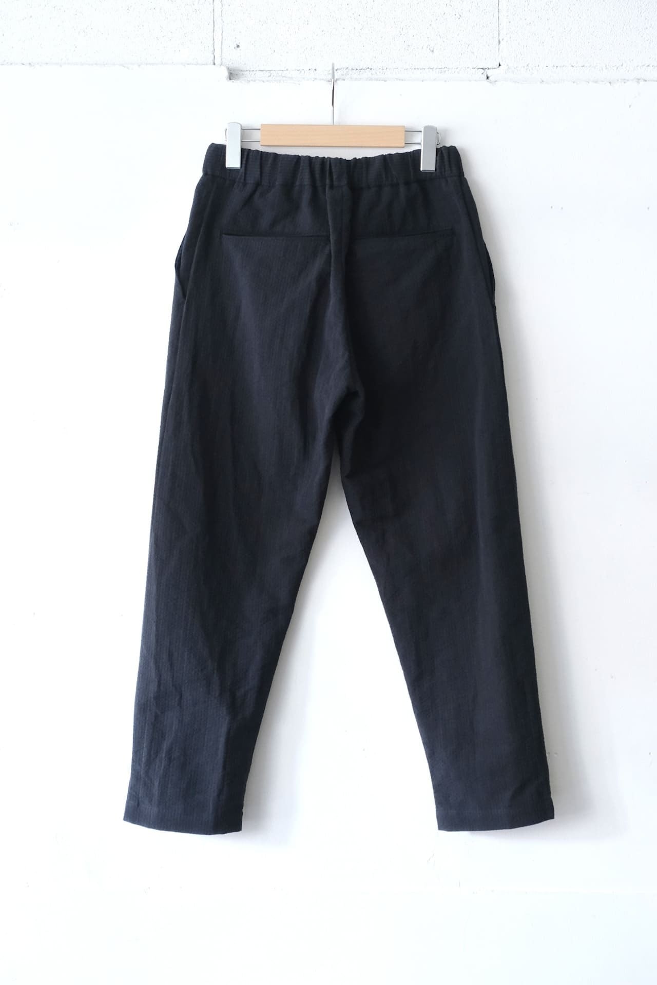 Cut from our original clothes, cotton and linen seersucker clothes. Reasonably thick, silky-feeling and uneven surface. Gently tapered down to hems with a beautiful silhouette. Easy and comfortable to wear with an elastic waist drawstring. Stripes will be a key element for a style so undertone tops will be a perfect combination. We also have a N.O.UN Jacket and B/S Shirt with the same clothes.