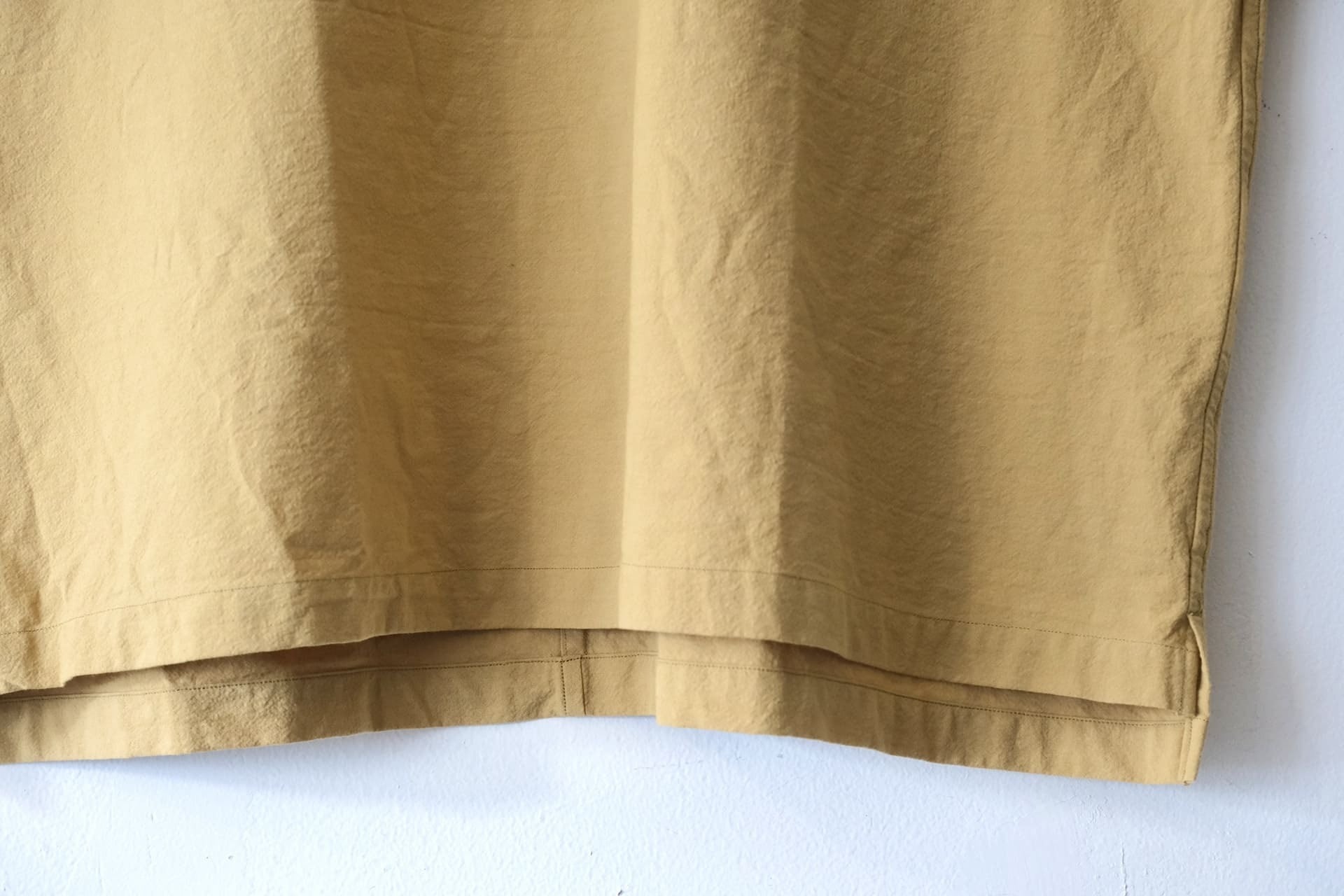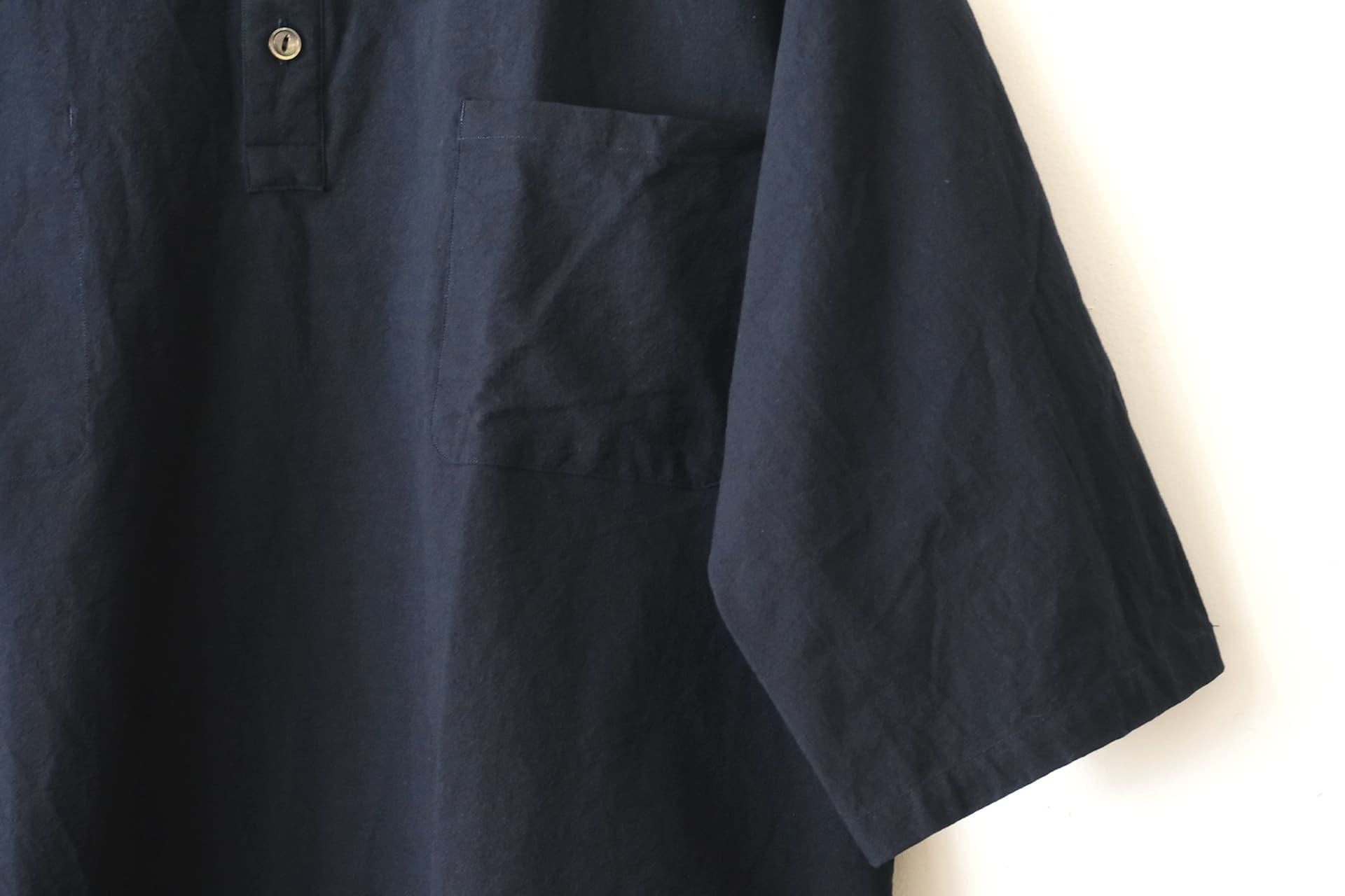 Made of our original 100% cotton cloth with an uneven surface. Reasonably thin and dry-feeling. Detailed with the single front panel with a characteristic silhouette and elbow-length sleeves. Easy and comfortable to wear with a henley neck style. A laid-back silhouette will be perfect for your summer style. We also have the Cargo Pants with the same cloth as the Henley Neck Shirt.