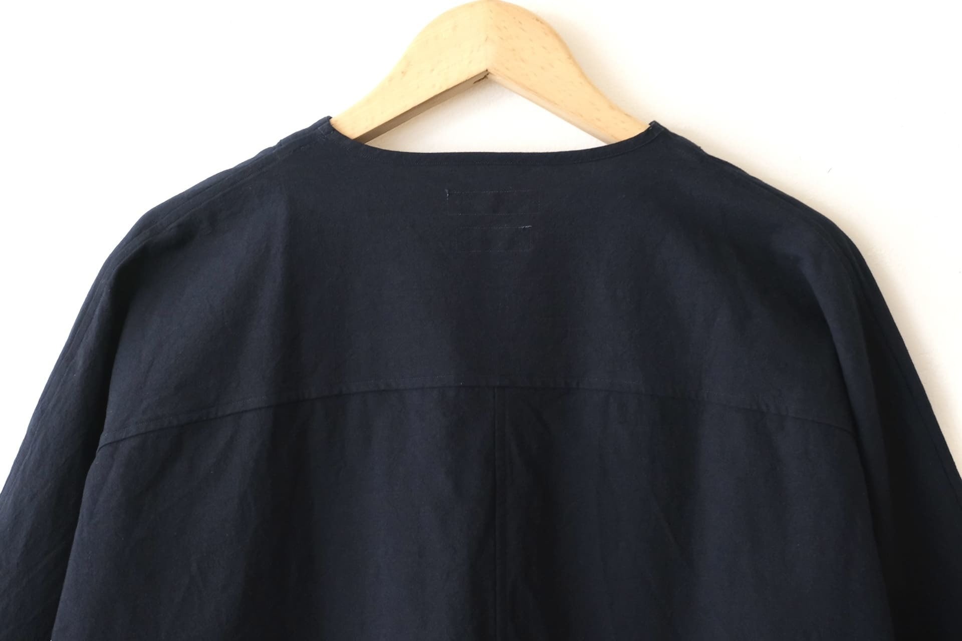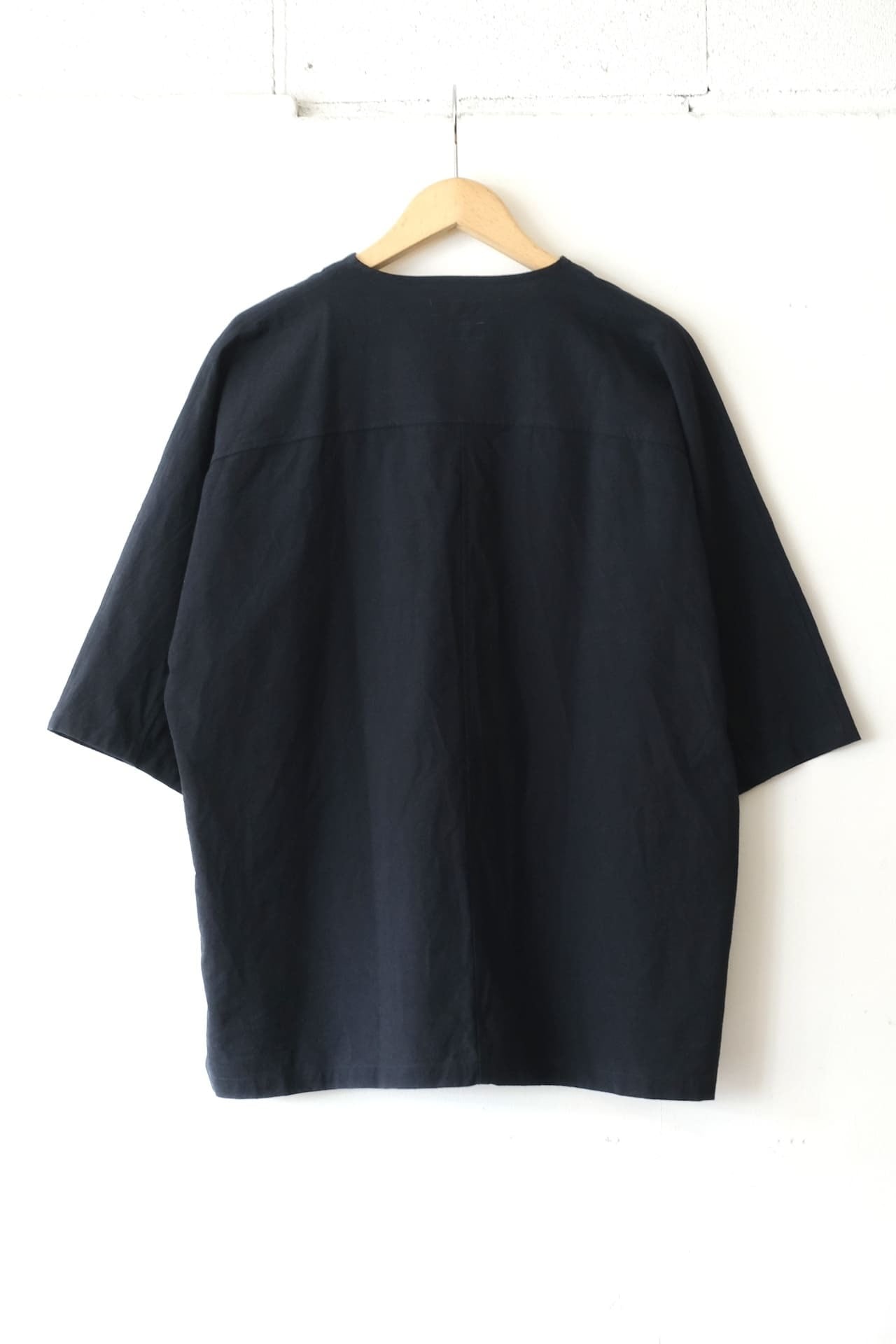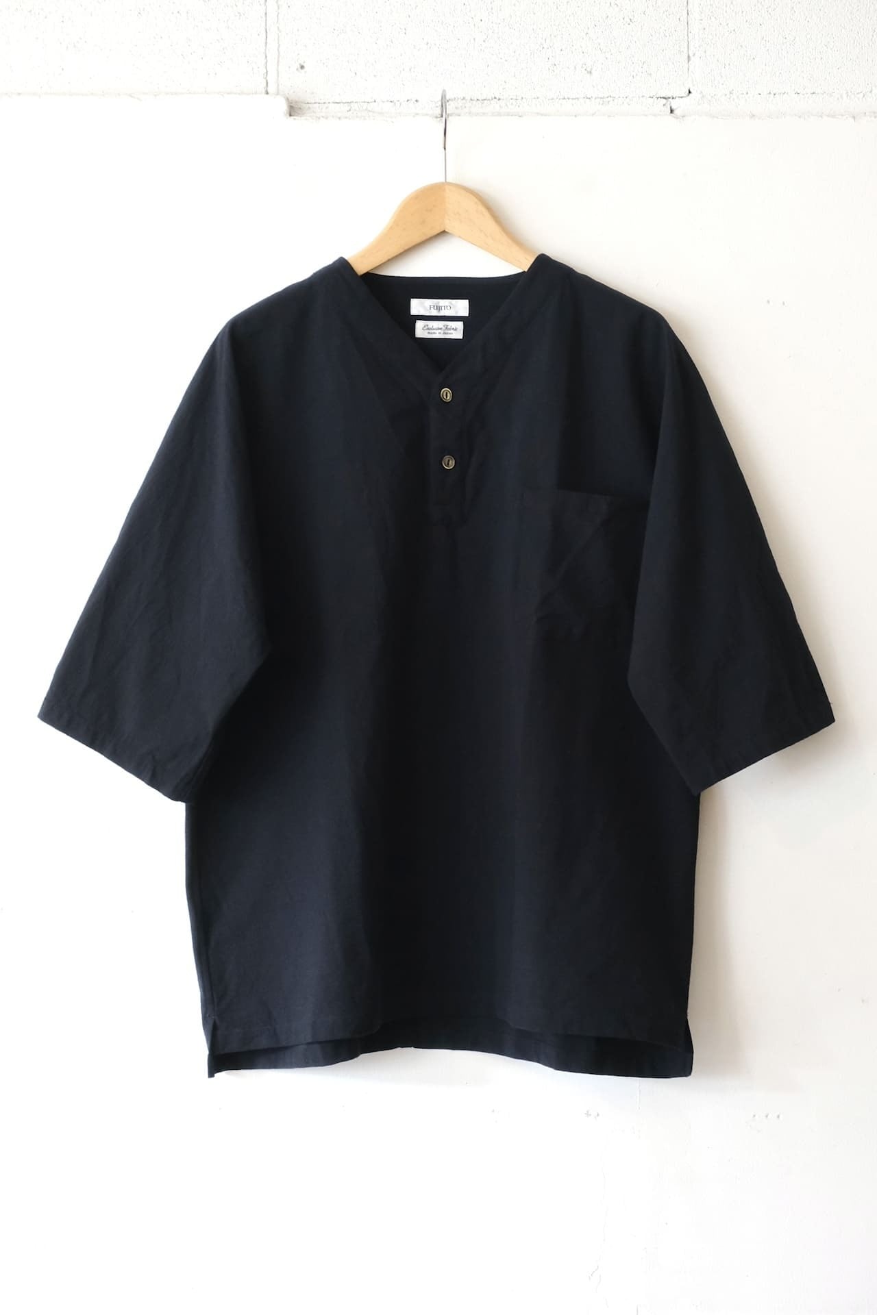 前見頃は一枚はぎで独特なシルエットになっていて、5部袖のヘンリーネックタイプになるのでリラックスして着ていただけます。