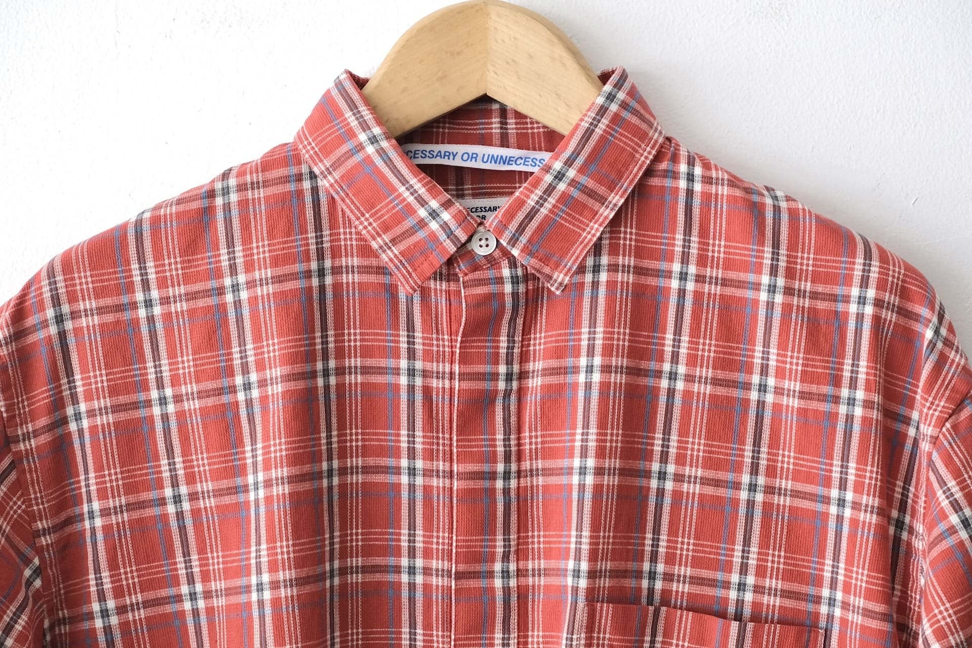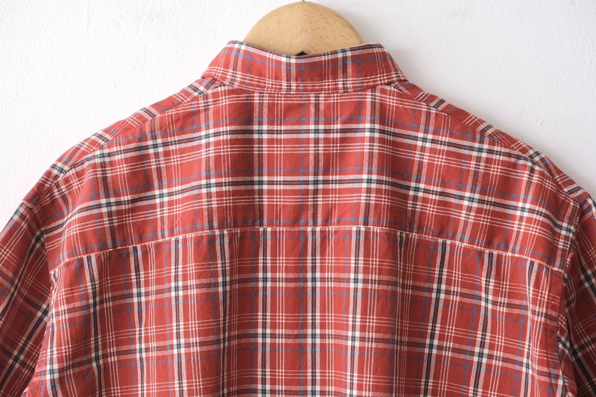 Made of 100% cotton, however it has a linen-like silky and dry feeling. Detailed with a laid-back silhouette, a pull-over style and smallish and deep fly-shape collars. A nostalgic red tone will be easy and match with everything.