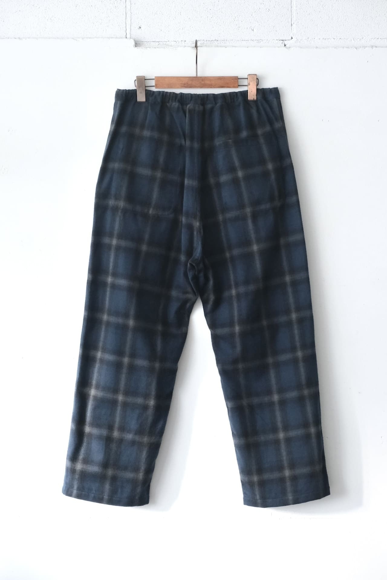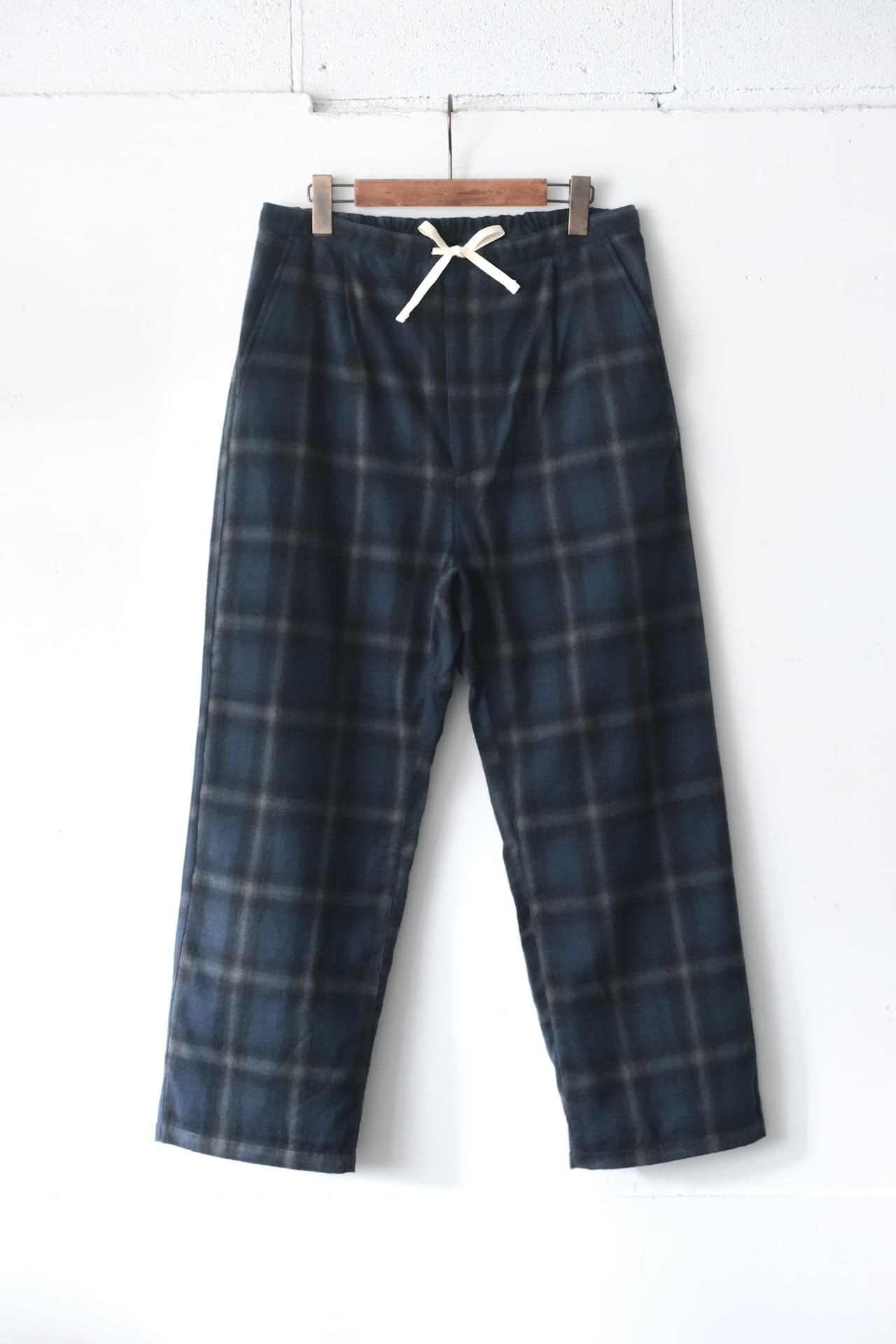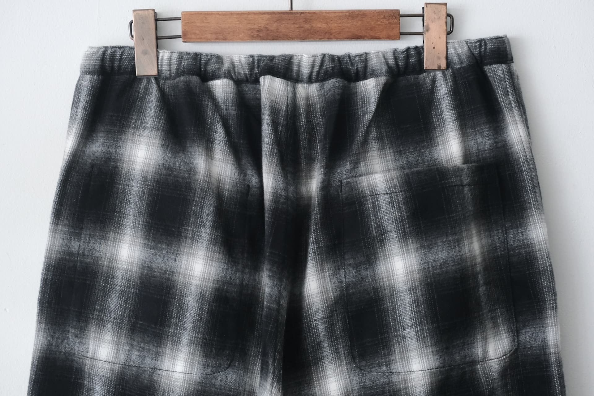 Built with brushed finish ombré-check patterned cotton. Designed in a slightly wide fitting shape from thigh to hems. Easy and comfortable to wear with a waist string. Pockets on the front-sides and the backside of both the inside and the outside. Effortlessly comfortable to wear with a soft feeling texture. Also we have the Ring Shirt with the same material as these pants.