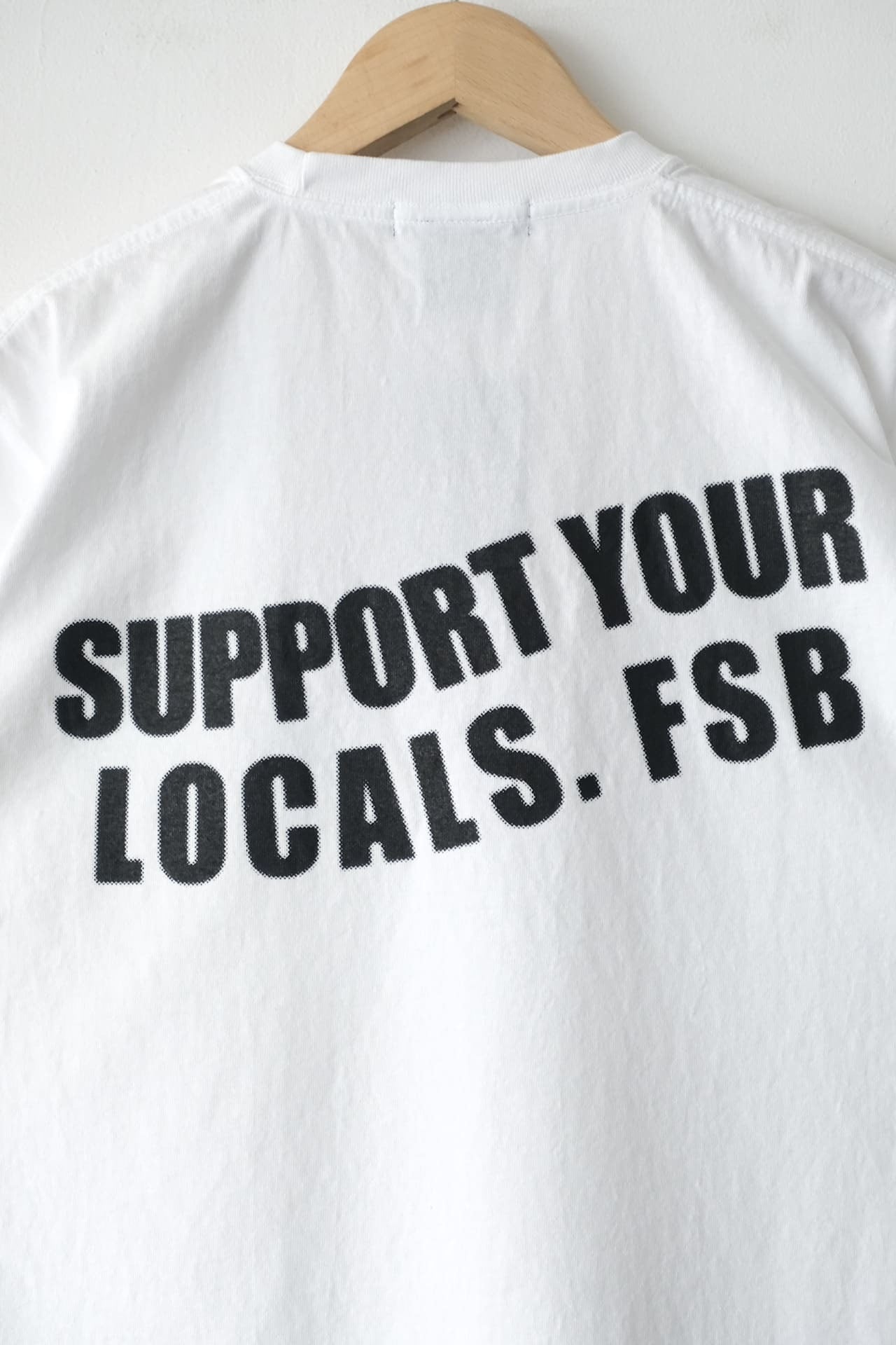 背中側の'SUPPORT YOUR LOCALS. FSB'のプリントは、'foggy'というように少しボヤけたような字体が特徴的です。
