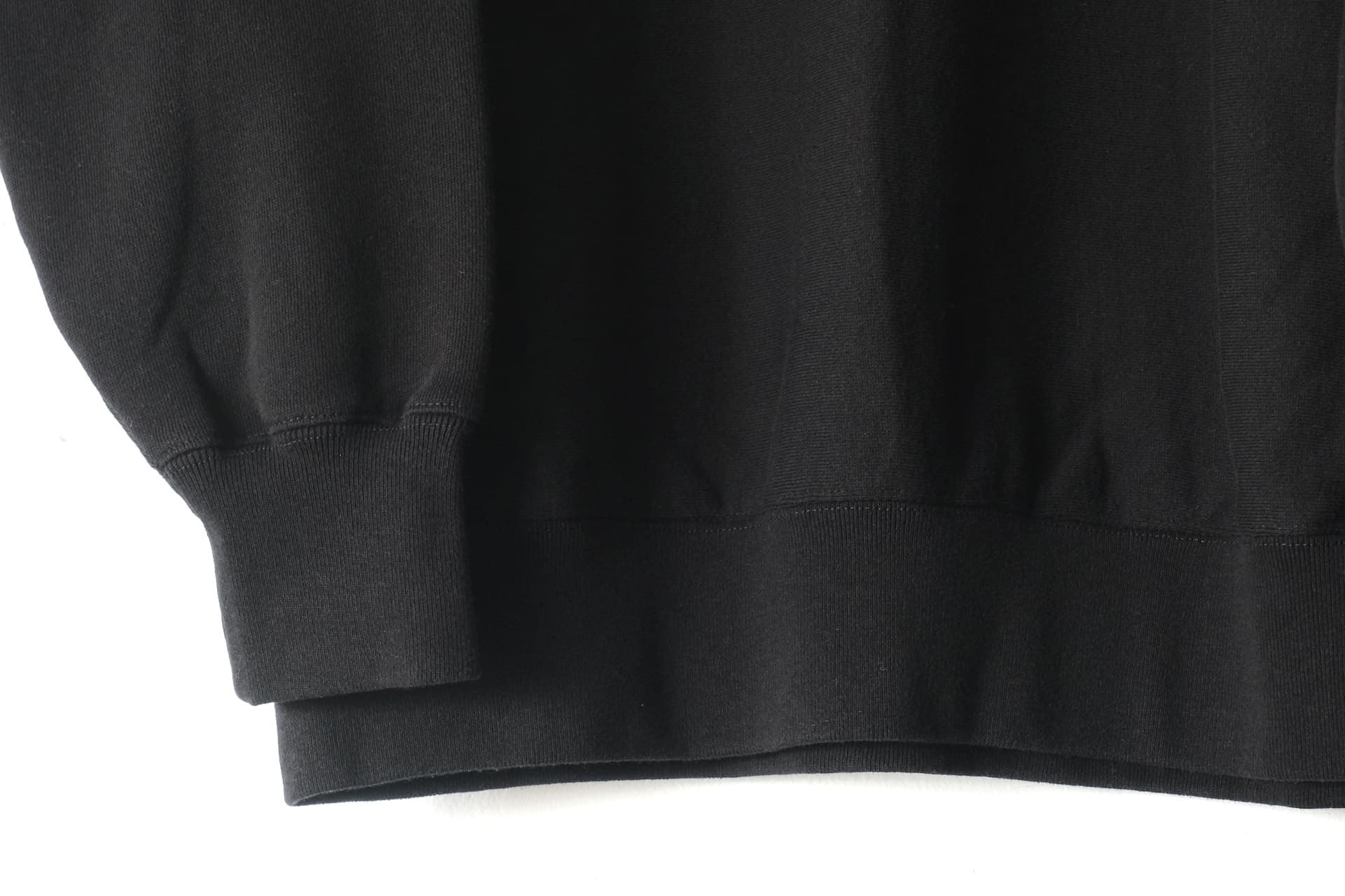 このクルーネックスウェットはコットンとポリエステルの混紡素材のボディを使い、フォギーブラックは胸位置から上部分に着古したような色落ち加工を施しています。