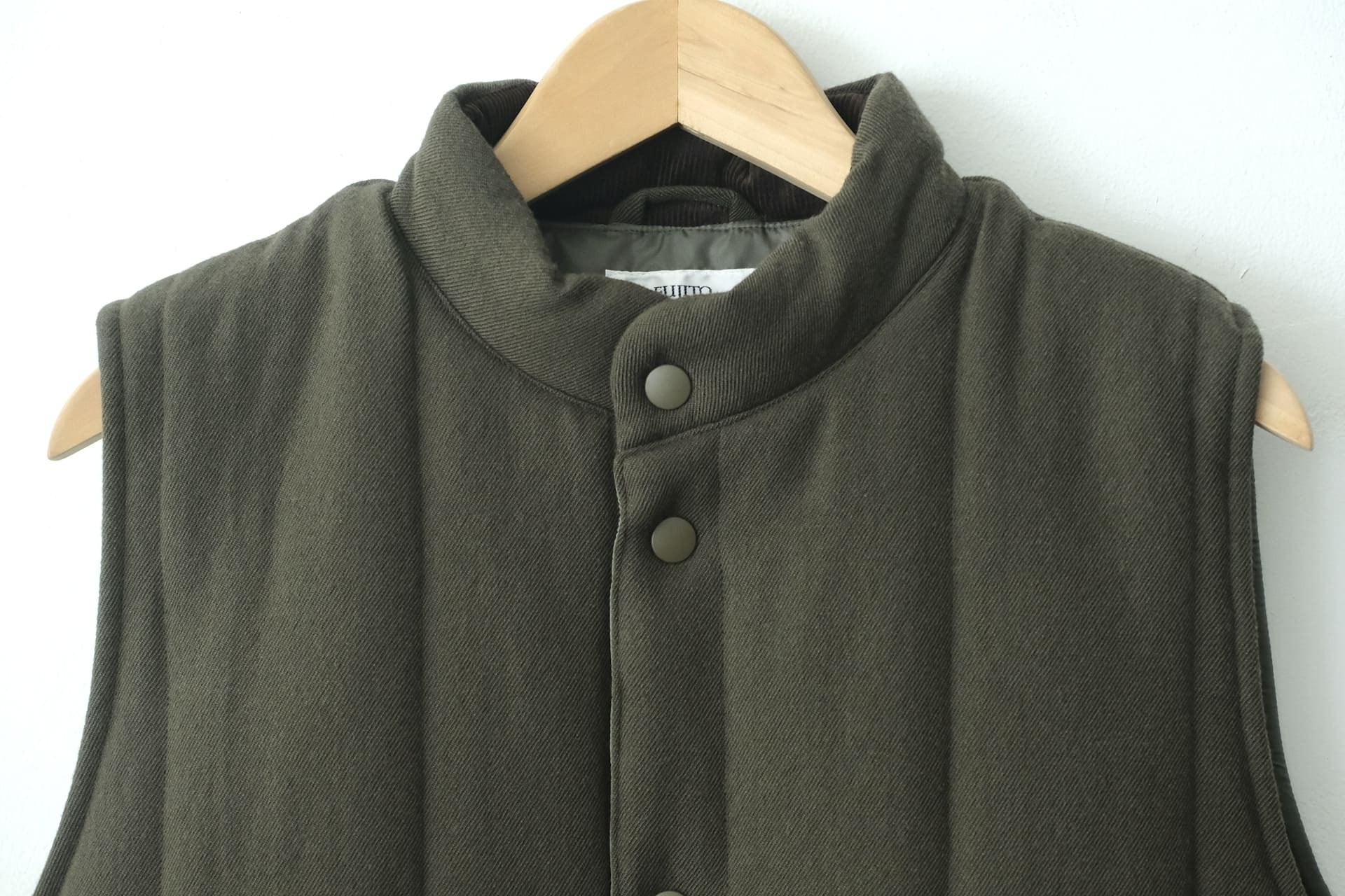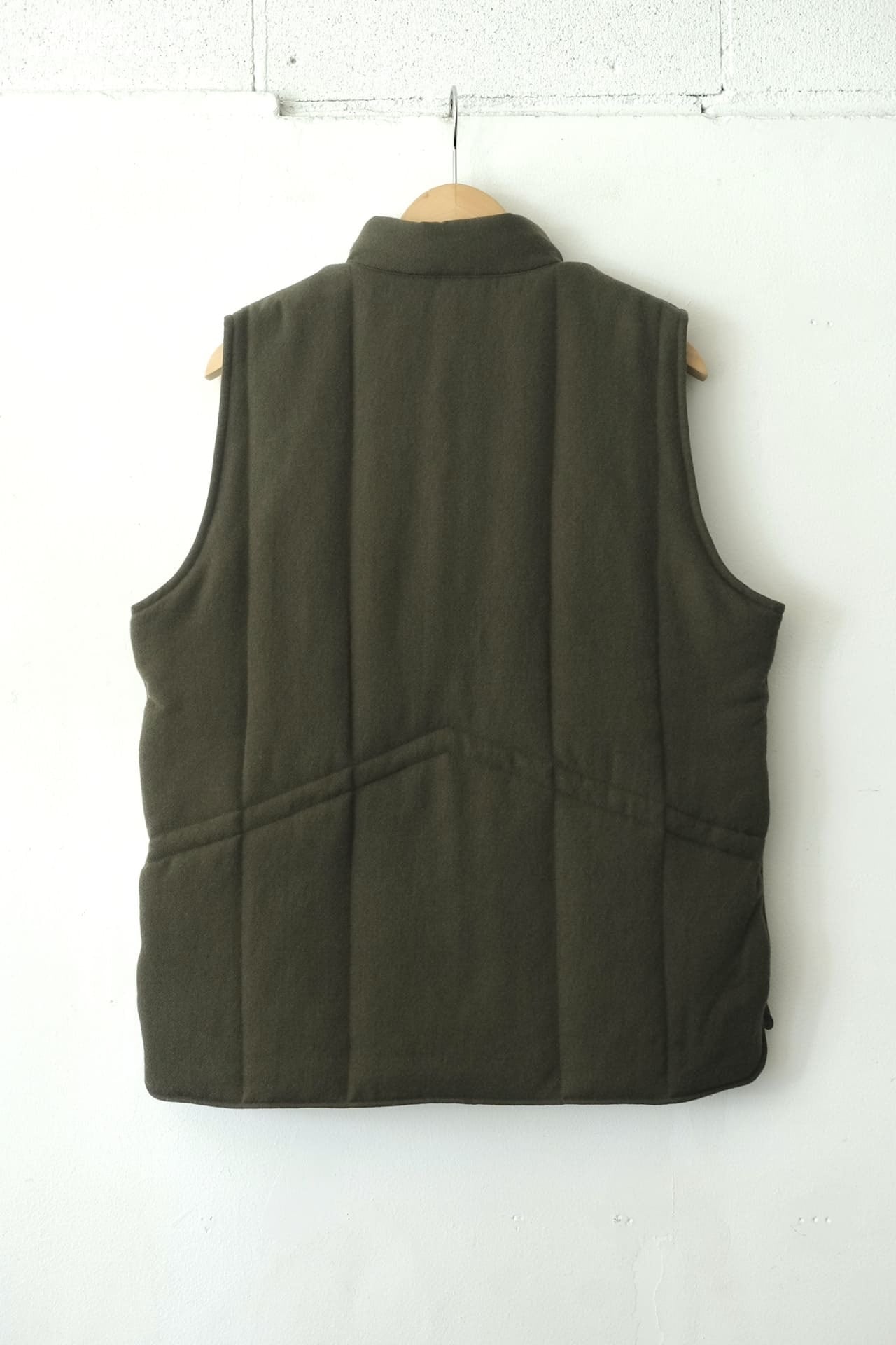 このベストは、タンブラー加工を施した独特な凹凸感が特徴的なウールサージ素材を使用しています。
