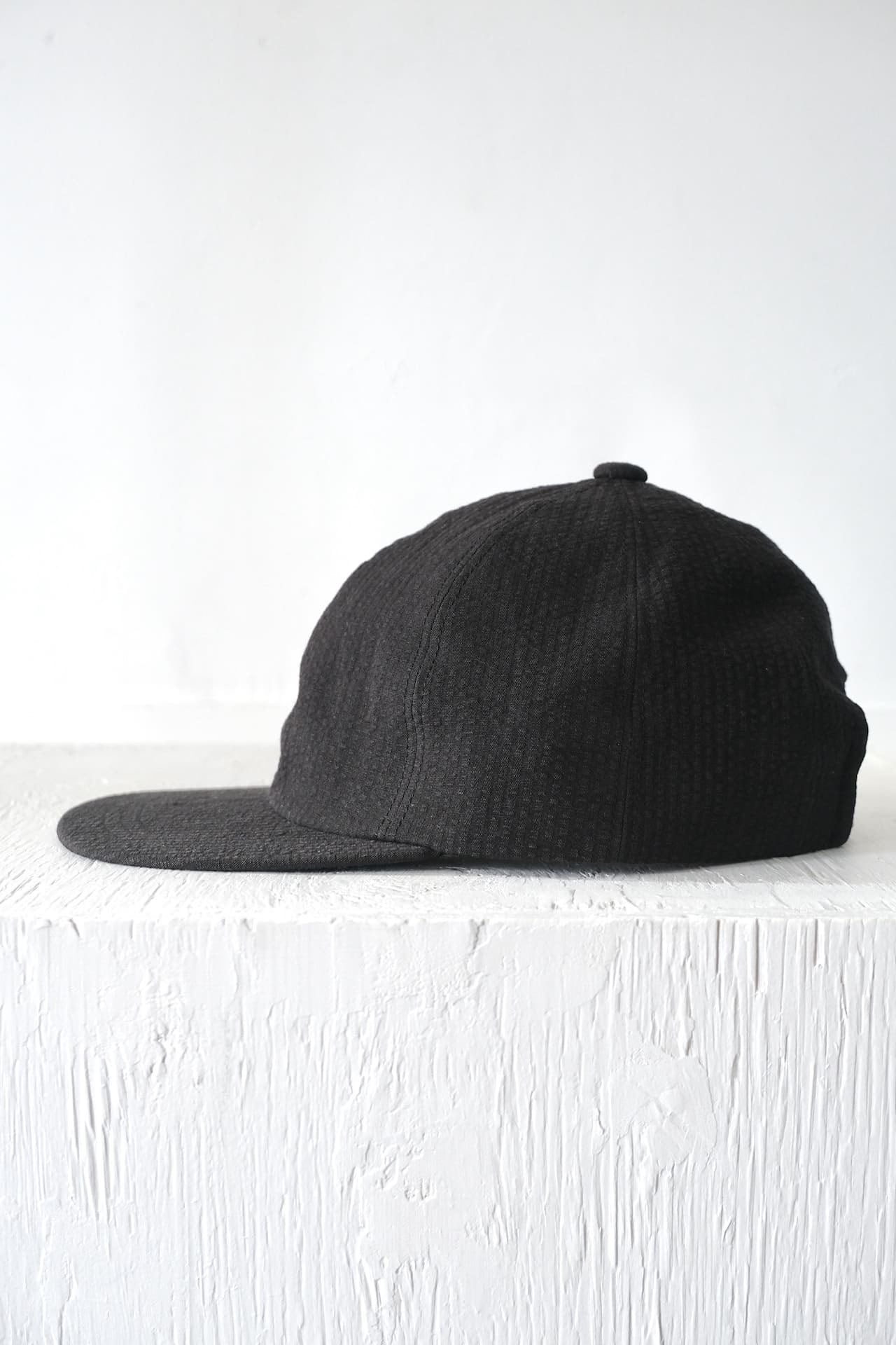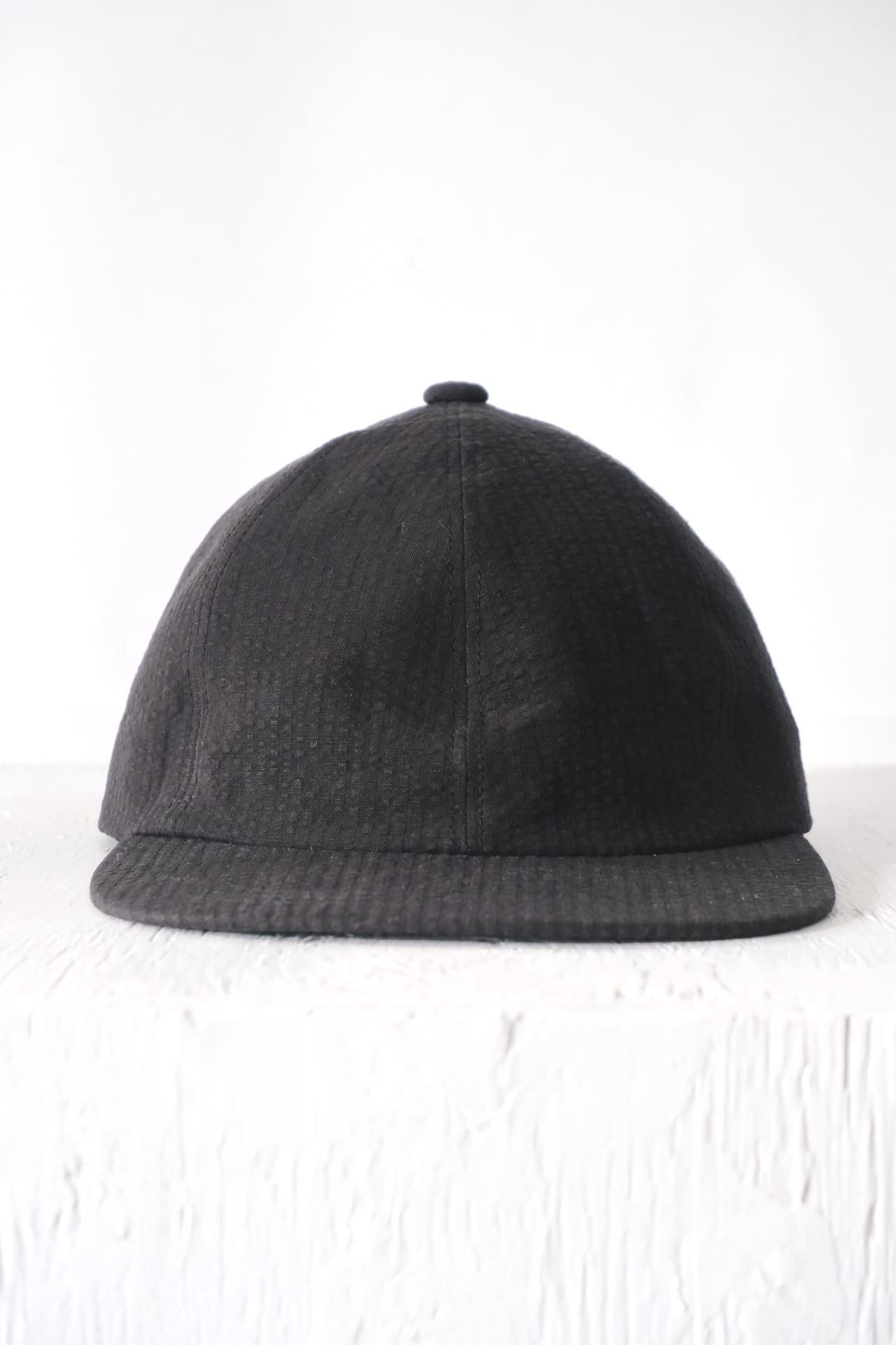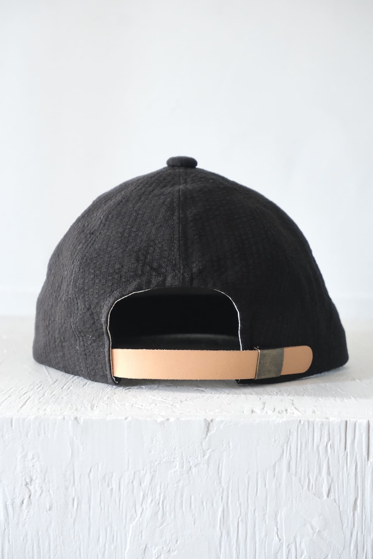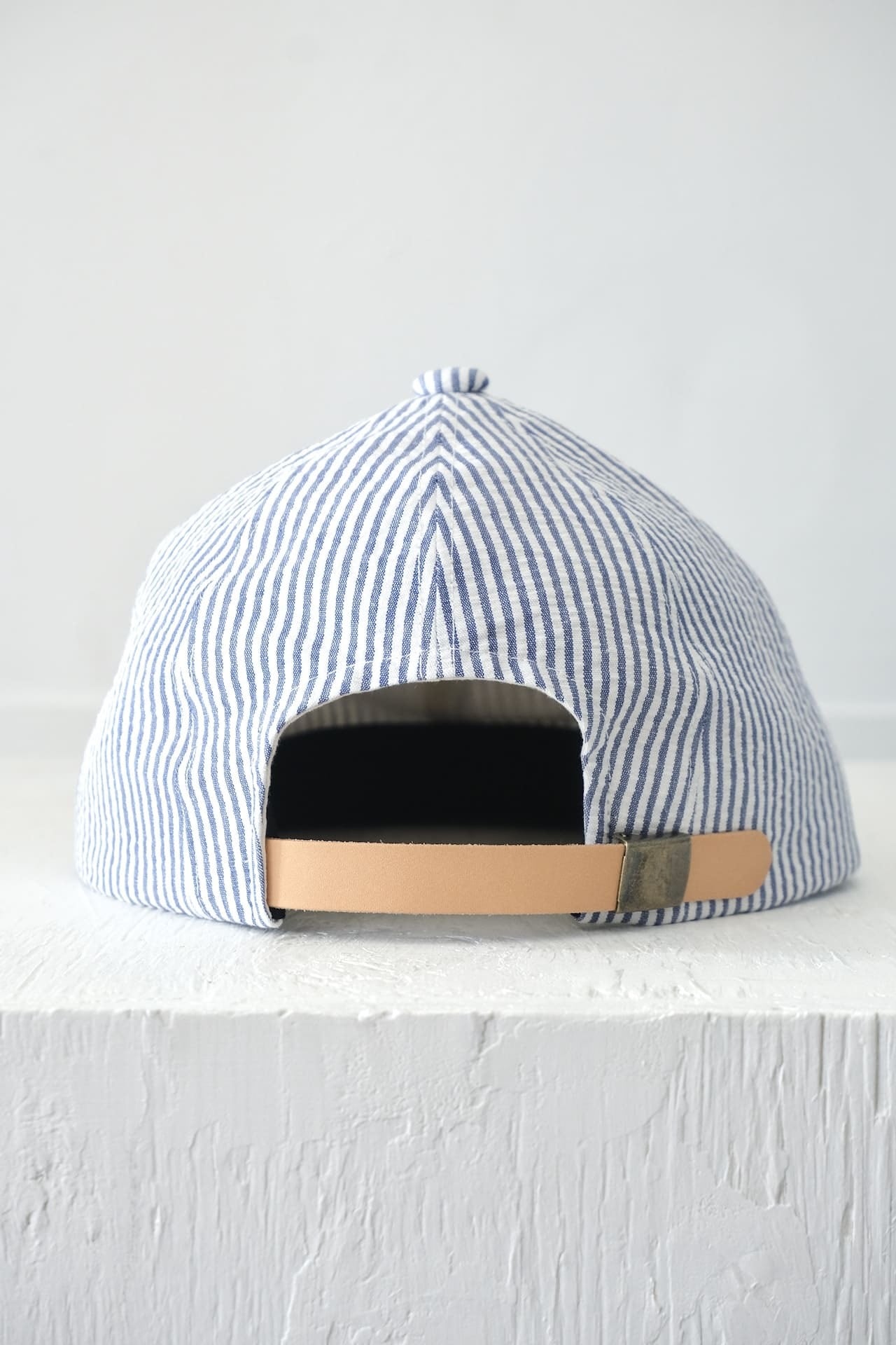 このキャップはオリジナルファブリックのリネンとコットンのシアサッカー素材を使い、程よい厚みで凹凸感がありサラッとした着心地です。